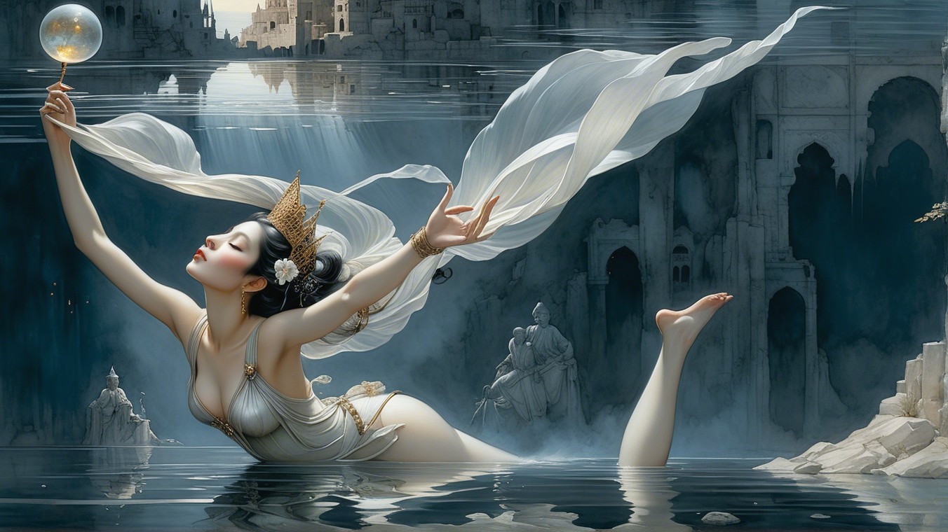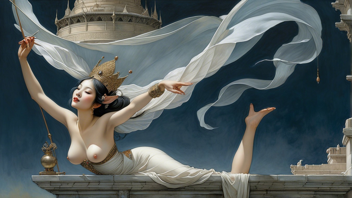 A serene figure adorned in elegant attire, holding a delicate object. She is framed by a moonlit sky, with a majestic bird perched nearby, surrounded by ornate lanterns and distant pagodas.