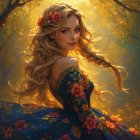 A nymph with long, flowing hair adorned with flowers stands amidst a magical forest. Her vibrant, floral dress blends with the enchanting surroundings, illuminated by a warm, golden light.