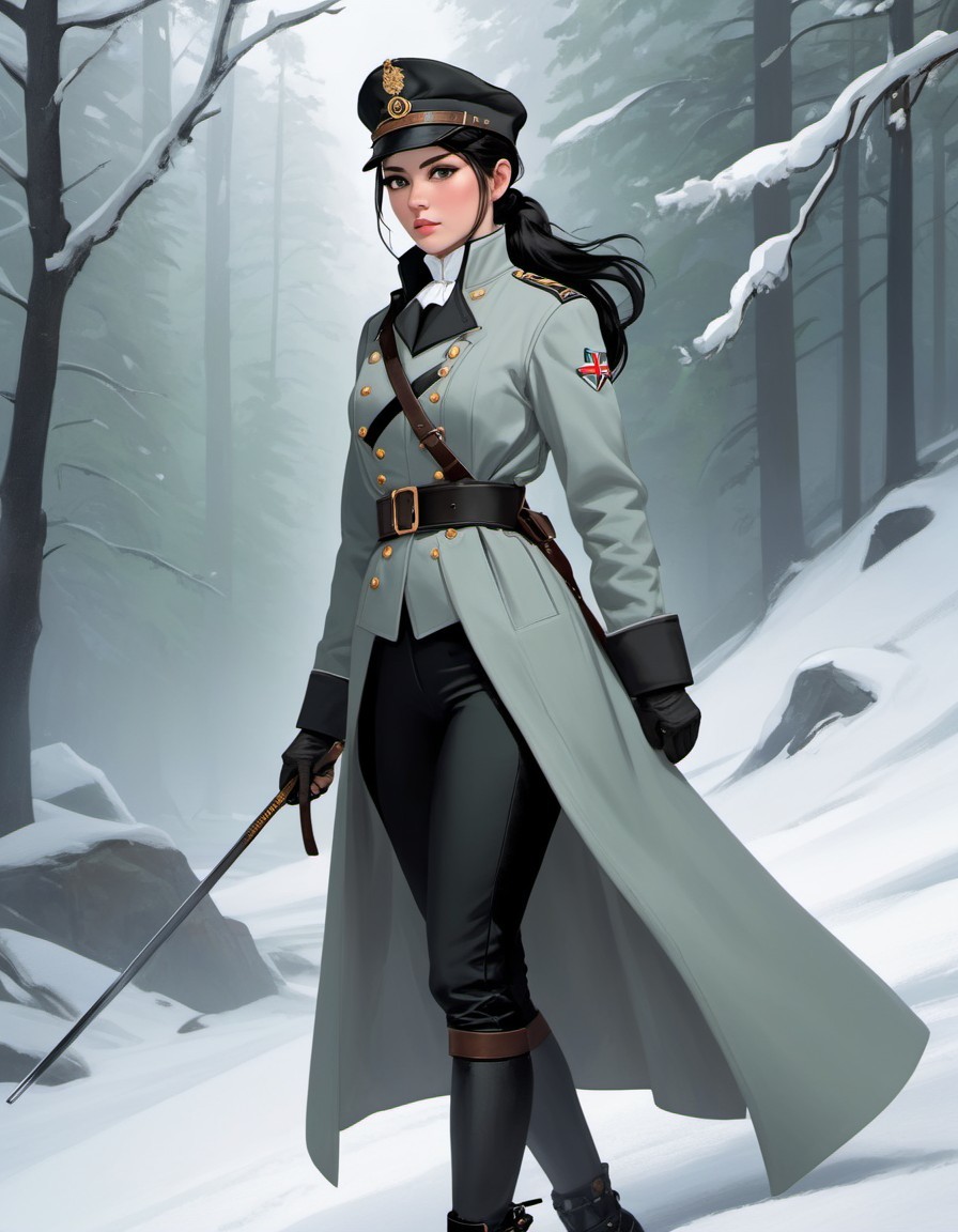 A person in a military-inspired coat and hat stands confidently in a snowy landscape.