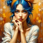 Evolved experiment II. A young woman with striking blue hair and a yellow headband gazes thoughtfully at the viewer. The background features warm, golden hues and floral elements, enhancing her expressive, delicate features.
