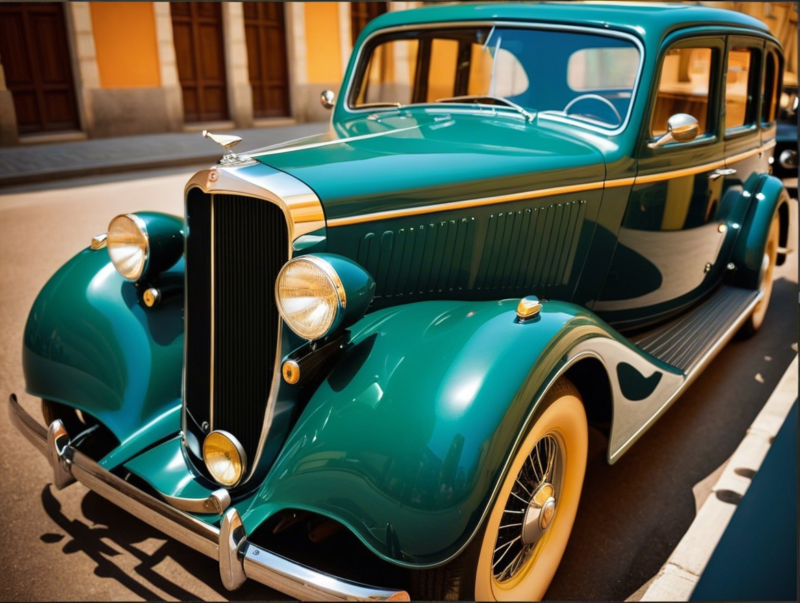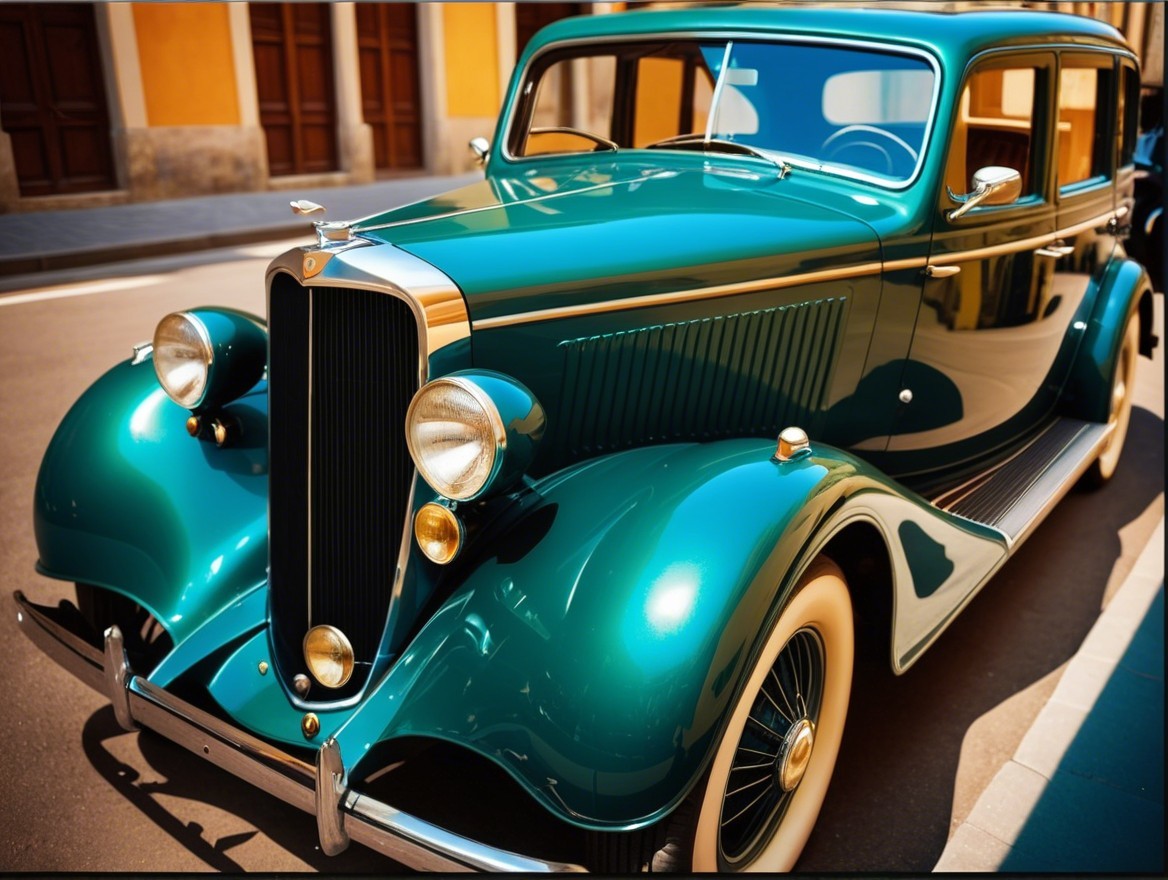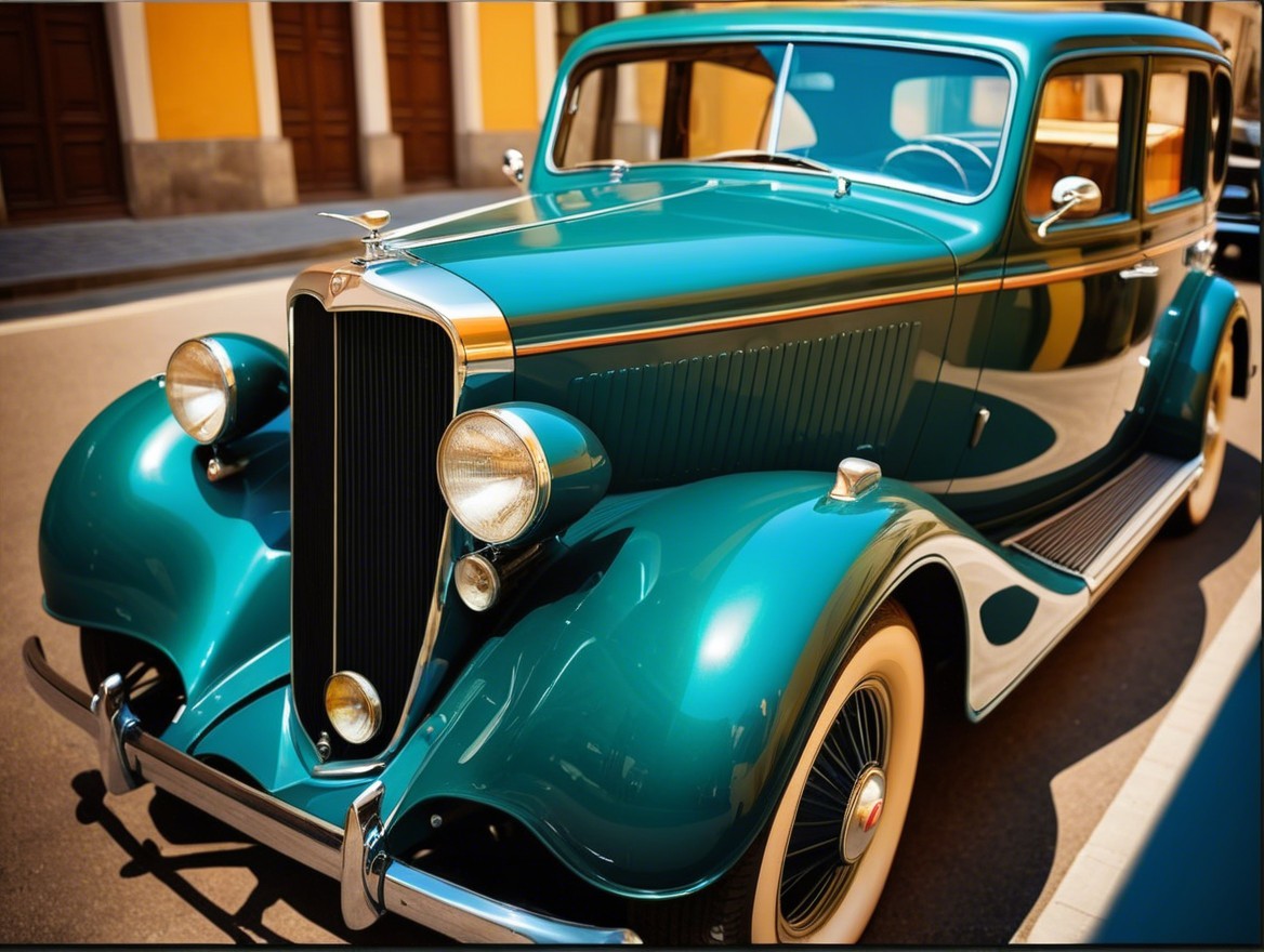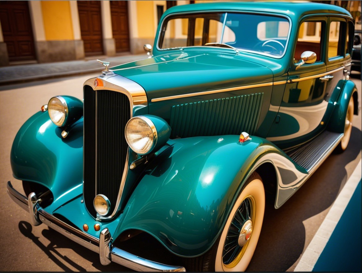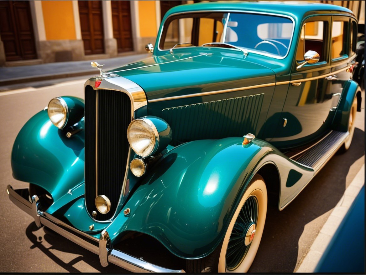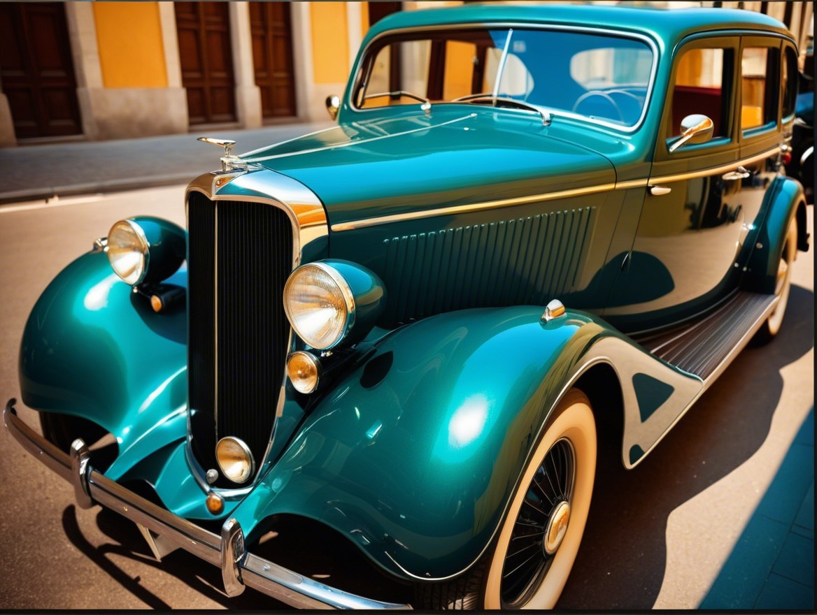 A vintage teal car gleams in the sunlight, showcasing its classic design with rounded headlights, a sleek body, and chrome accents, parked on a charming street with historic buildings.