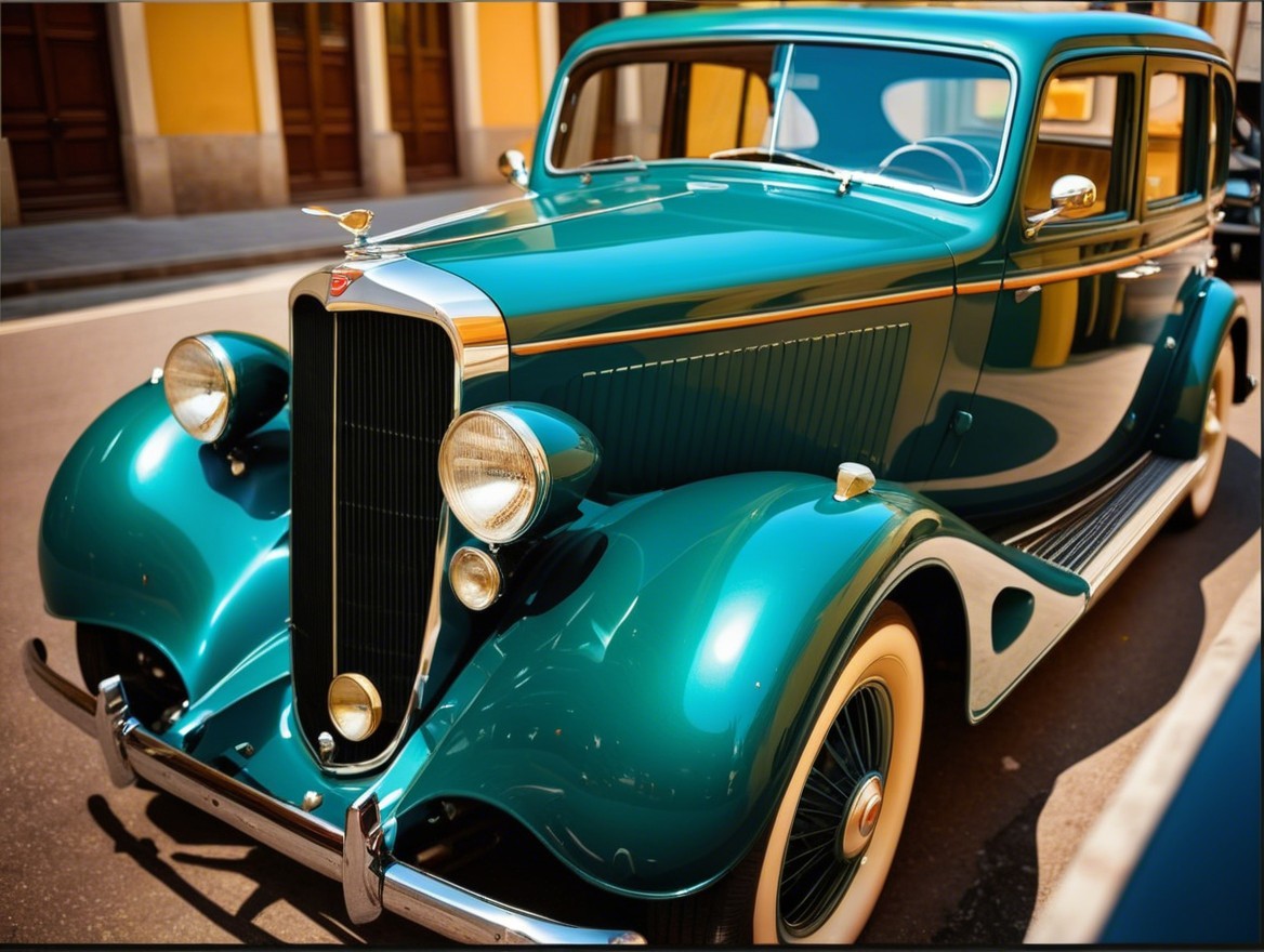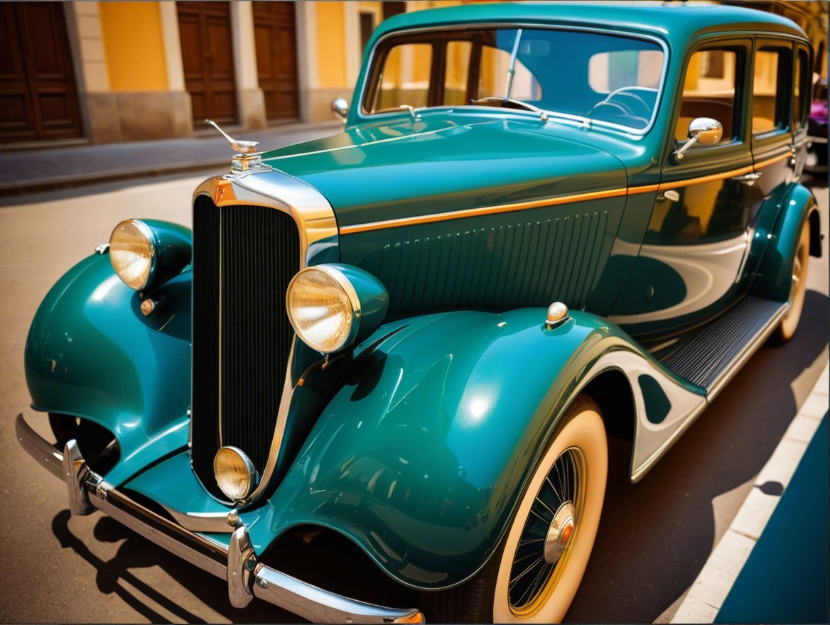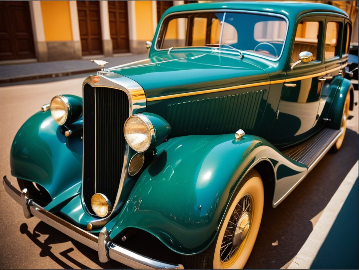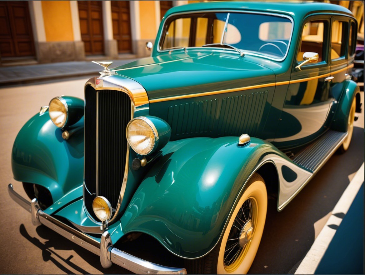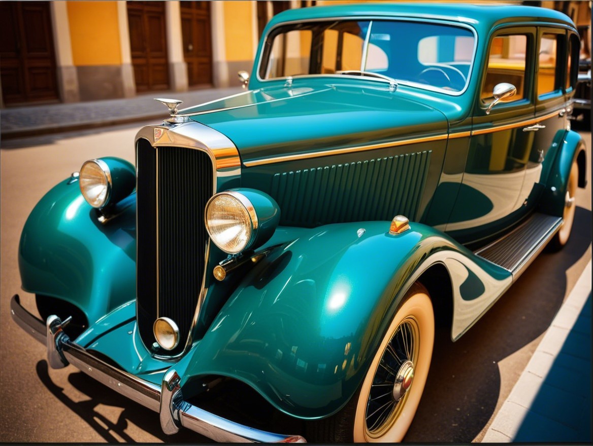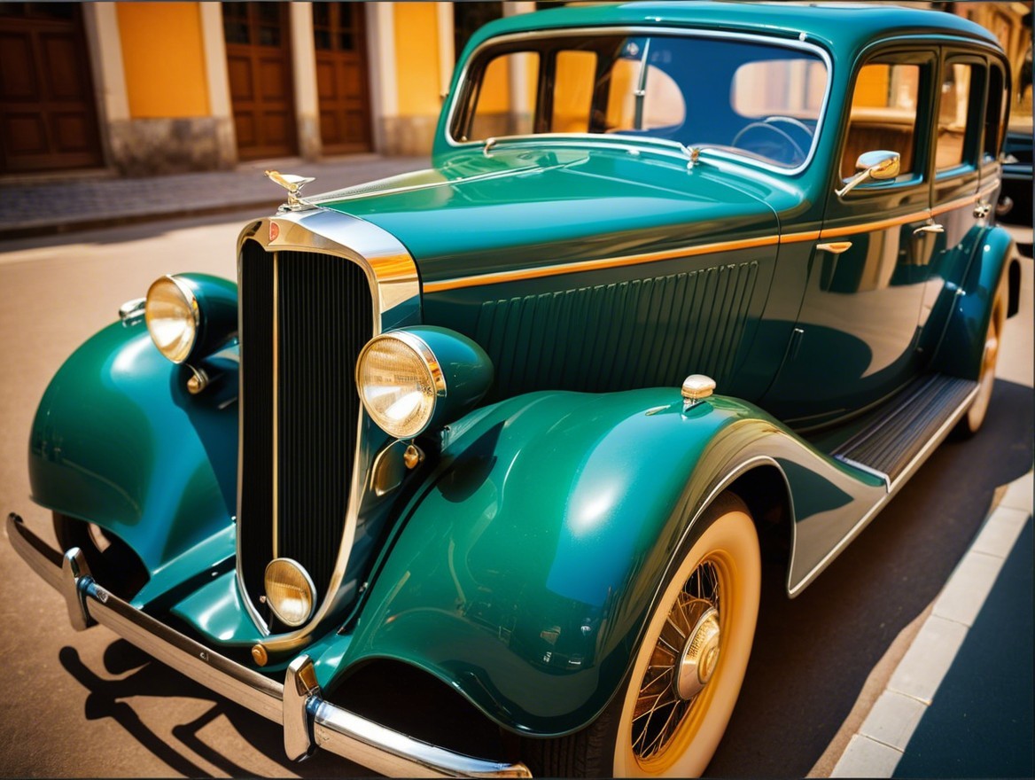 A vintage teal car gleams in the sunlight, showcasing its classic design with rounded headlights, a sleek body, and chrome accents, parked on a charming street with historic buildings.