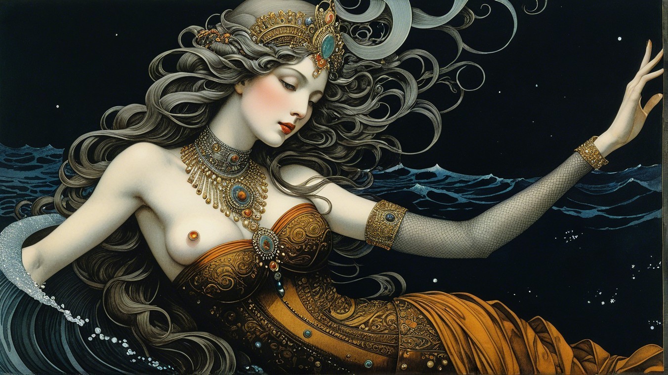 A stunning woman with flowing silver hair, adorned in a golden, intricately designed dress, emerges from swirling ocean waves, exuding elegance and a mystical aura against a dark backdrop.