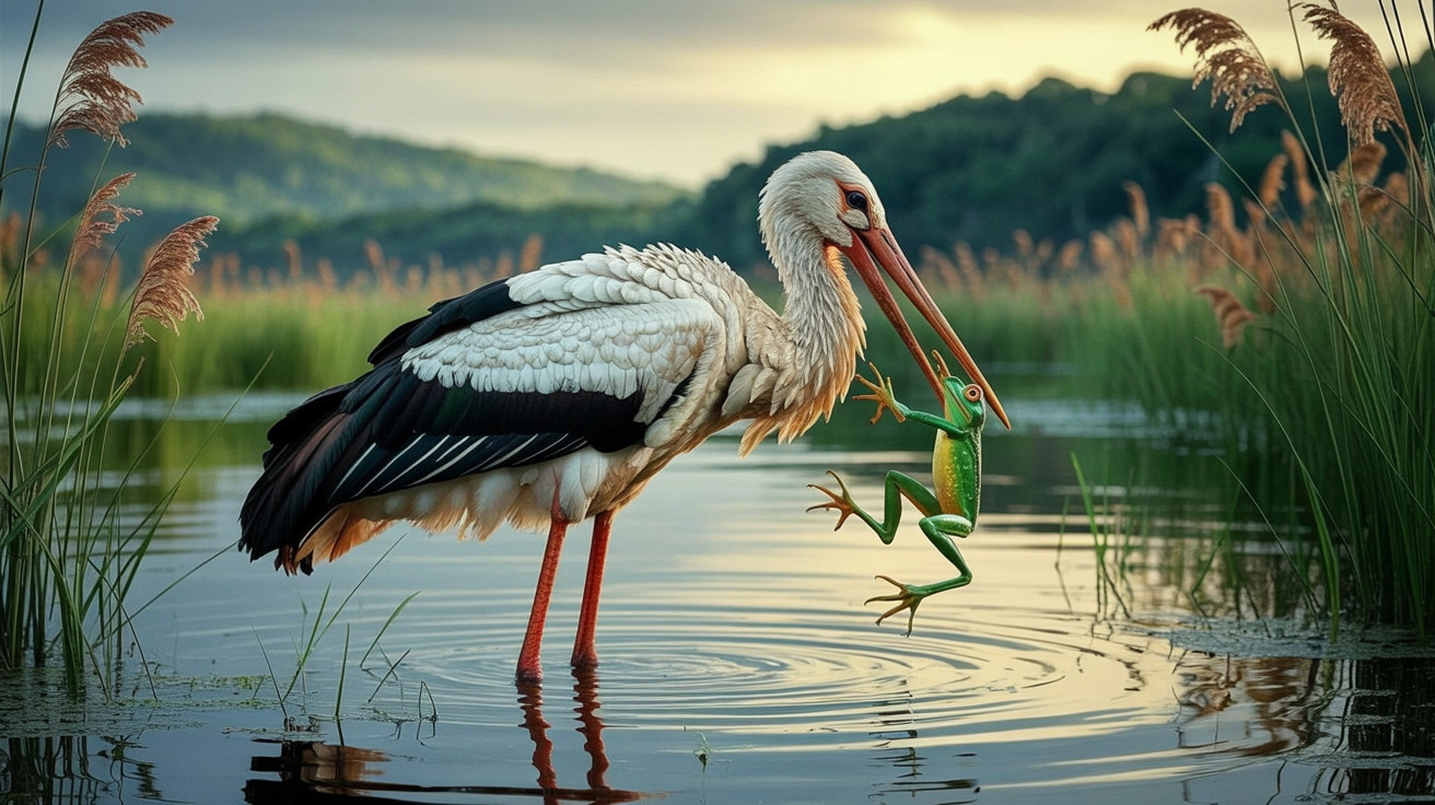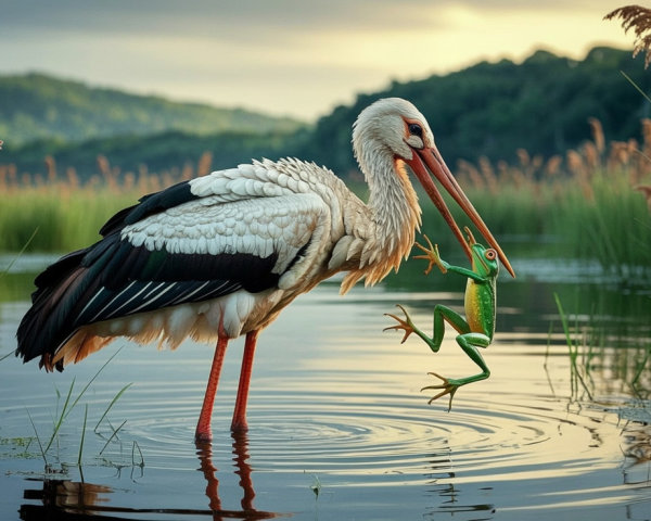 ("In the open beak of the stork there is a frog that strangles and "tightly squeezes" the stork's neck with its paws"). In the foreground is a carefully drawn, realistic scene in the natural environment. In a shallow freshwater swamp, among dense thickets of reeds with long green stems and brown flowers, stands a tall, large white stork. His feathers are worked with precise texture - you can see the individual feathers, fine grayish veins, light natural shine. Powerful orange legs with clearly defined joints and claws rest confidently on the leathery bottom. The stork stands in a slight incline, his long, curved neck tensely extended forward, and his yellow-orange strong beak is wide open. Inside the beak is a green swamp frog, depicted with anatomical authenticity: its moist, velvety skin with slight reflection of light, thin membranes between long fingers, clearly visible muscles of the hind paws. Her body is already partially in the mouth of the stork, but the forelimbs firmly squeeze the neck of the bird, creating a real, truthful tension. The frog’s fingertips are squeezed into feathers, slightly bending them, as you can see their paws clenched in a crisp grip, trying to prevent the inevitable. The eyes of the stork are wide open, in them - surprise and confusion, as if the predator did not expect such a strong resistance. Frogs' eyes are full of desperate determination, in them lives an instinctive struggle for survival. Both figures are imbued with anatomical truth: every movement, every curve is transmitted with attention to the biological details, creating a sense of complete authenticity. The water in the swamp is transparent, the roots of plants are slightly visible, there are small bubbles of air, the surface is swept by a light wind. Around - a quiet natural landscape: on the horizon dark green silhouettes of hills, rare trees, the sky is covered with a thin haze in which light clouds can be seen. The water reflects the sky and shapes, creating soft reflections and reflections that enhance the realism of the scene. The whole story is broadcast without caricature and grotesque - it’s a believable scene from the wild, which reflects a tough but natural struggle for life. Smart 4K UHD QLED where flawless 4K clarity meets intelligent Ai Opticolor. Trend on Artstation, Unreal Engine 5, IMAX Cinematic - 1080hd, OLED 8K, Photorealistic CGI/VFX by WETA_Digital, 4K, HDR and Quantum Dot technology for natural colours, Super HDR.