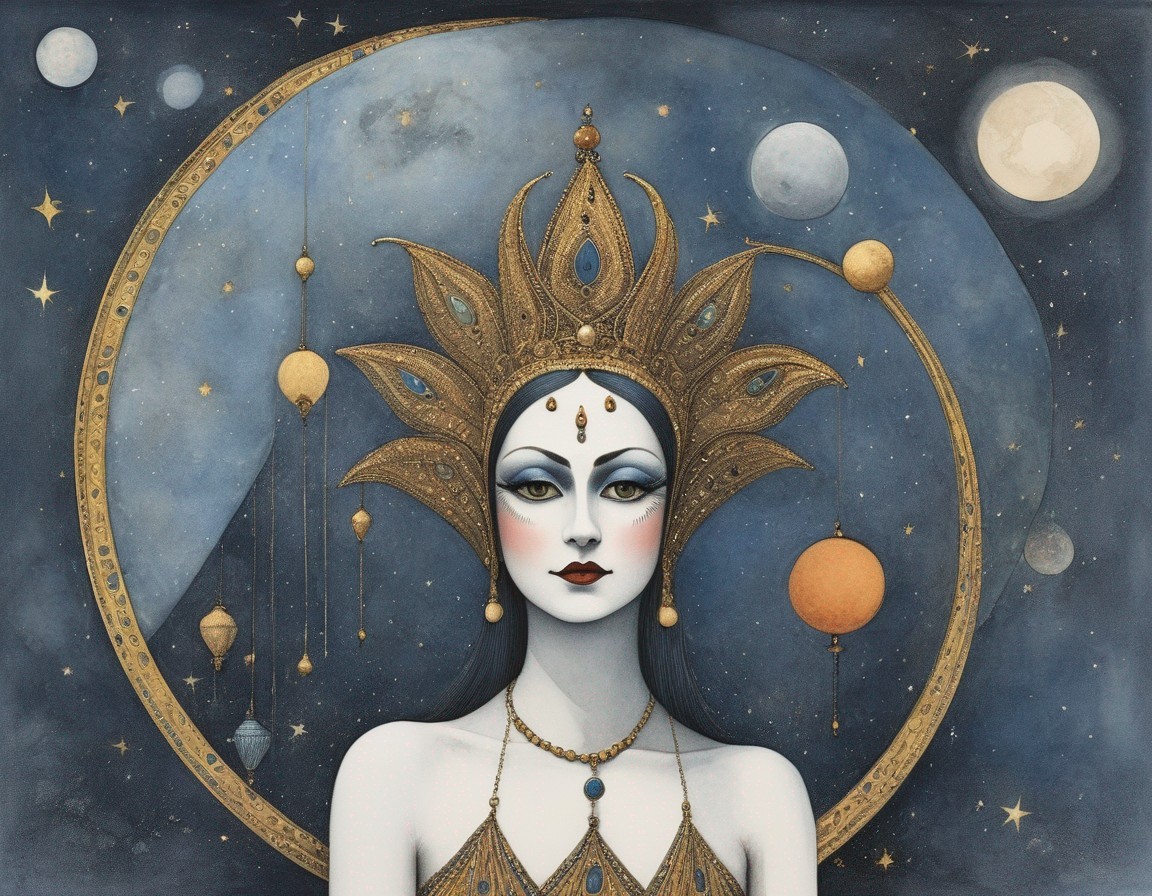 An illustrated cosmic deity with a starry backdrop, crescent crown, and celestial adornments.