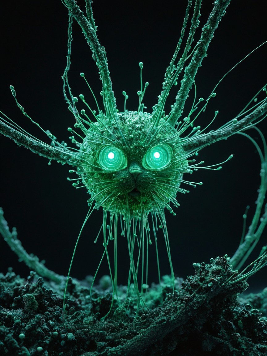 Prompt: Manipulate data, analog quantum duality errors, visual and auditory deffects, Moldy Boldy Art Microscopic Brut, Spectral deconstructed intertwined symbolism of moldy glitch and evoking a sense of cool harrowing sight. Abstract Surreal, by by Yu Jin Young Art glowing nuclear cat_shaped_core schizophrenia by award winning photography, dof, morbid bokeh
