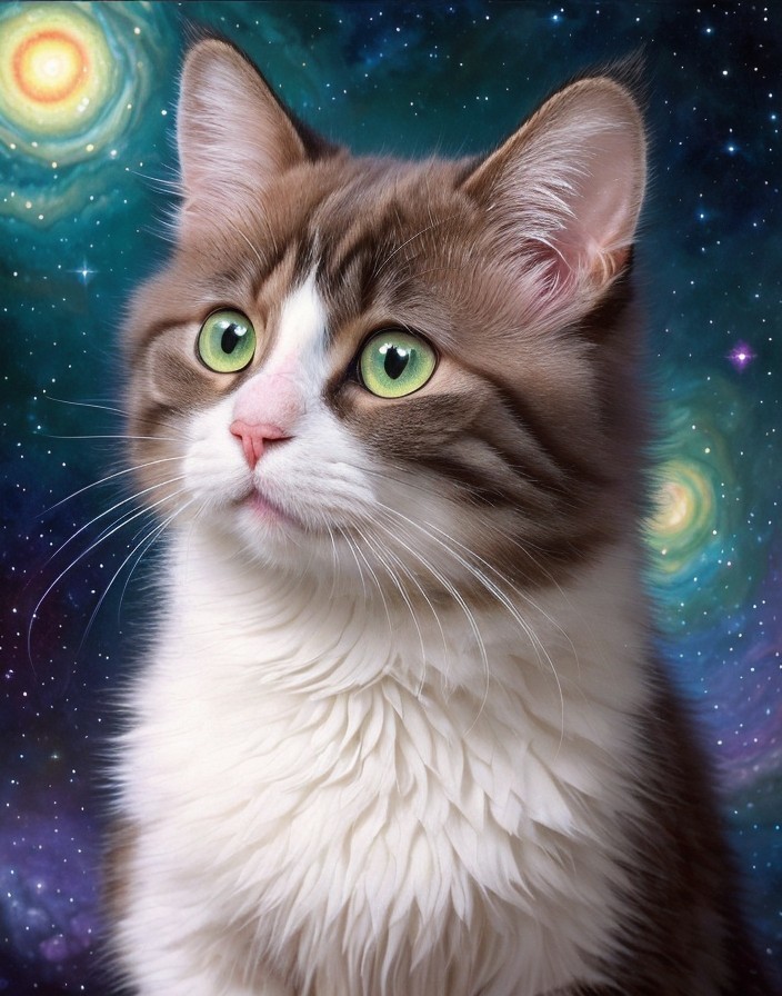 A fluffy tabby cat with striking green eyes gazes upward against a vibrant cosmic backdrop with stars and nebulae.