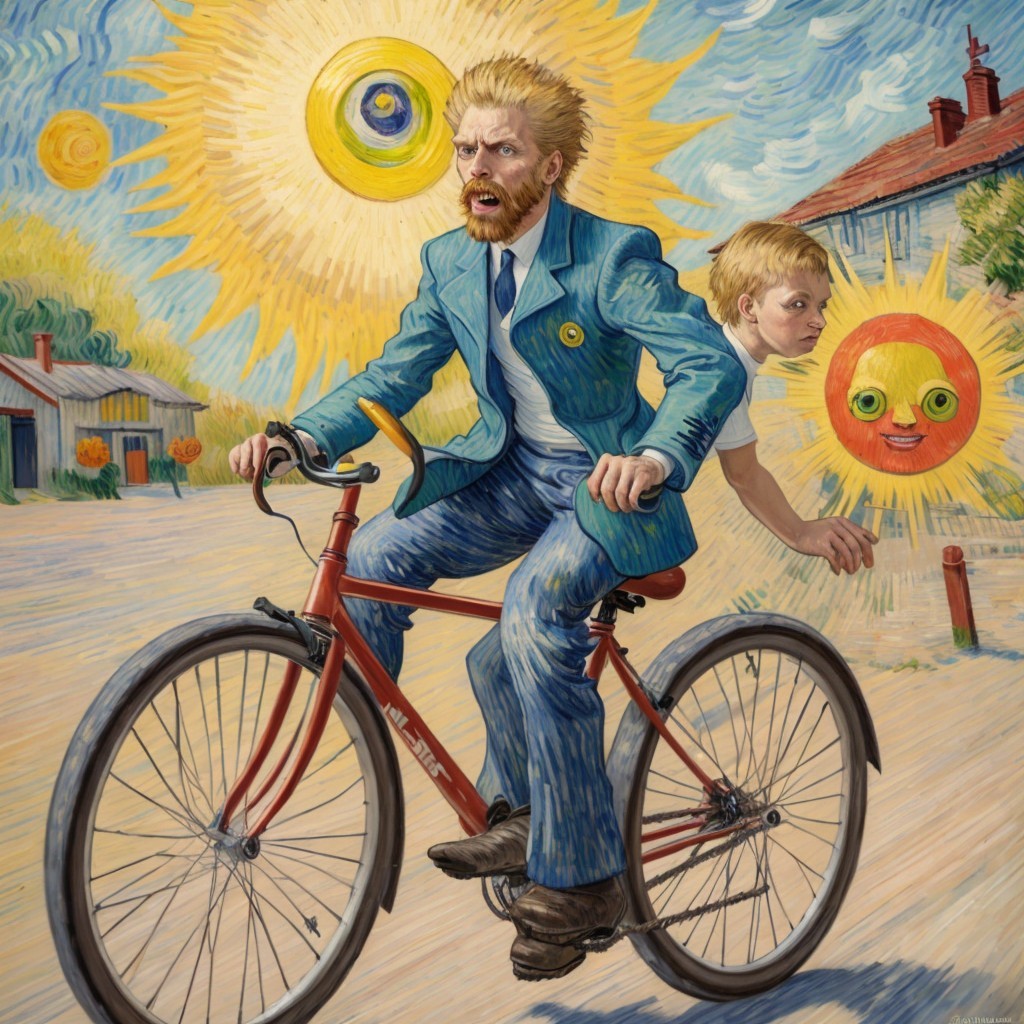A stylized painting of Vincent van Gogh riding a red bicycle, with a child on the back, against a backdrop featuring suns with faces.
