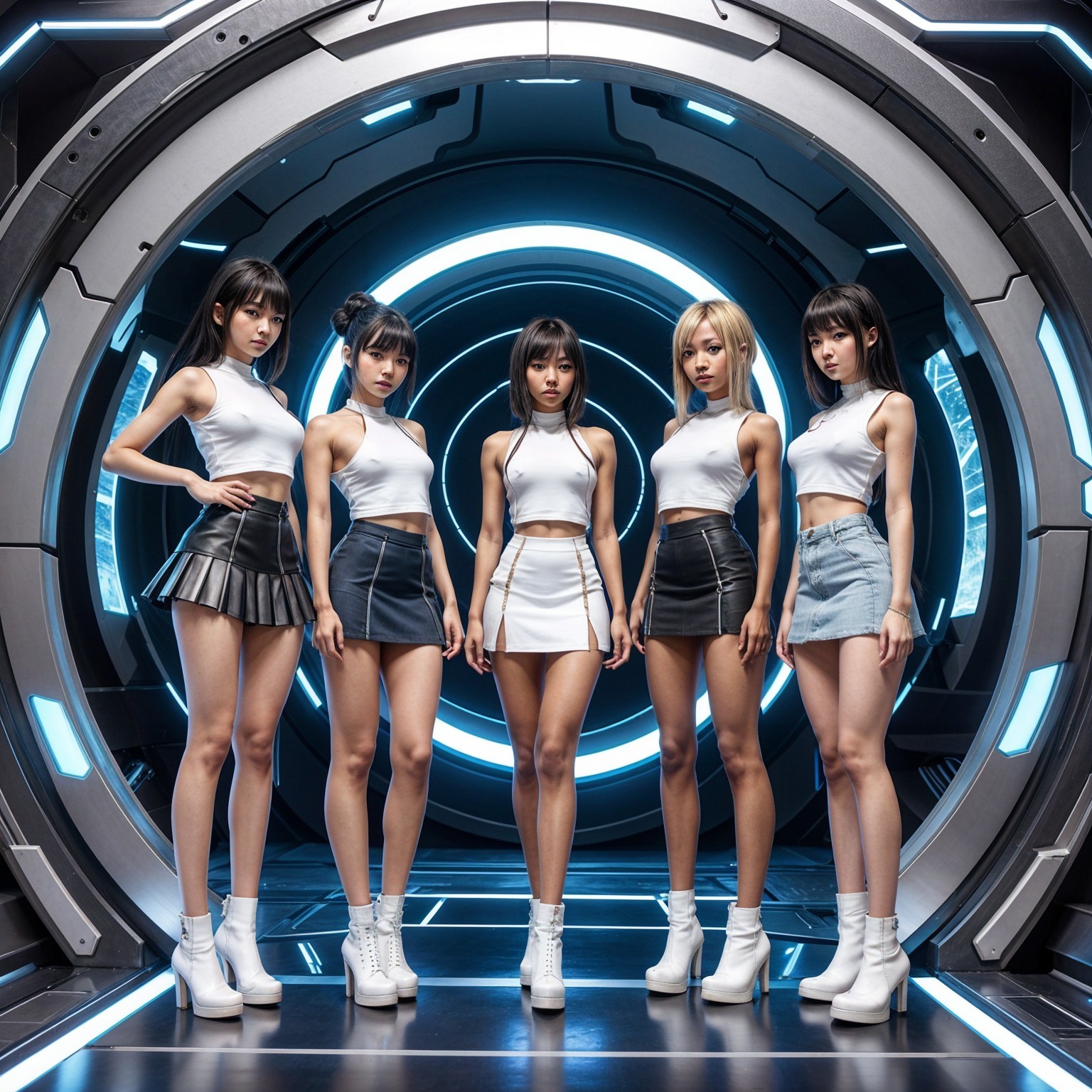 Prompt: Drawn by a famous anime artist, anime pencil drawing, a group of gorgeous Asian, European and African females in their 20s coming out of a futuristic portal, dressed in short tops and mini skirts, intricate details, seen from the front, full body, sci-fi futuristic setting, weird glass-like surface of the portal, portal to an artificial dimension, dark and moody feeling, showcasing excitement and fear.