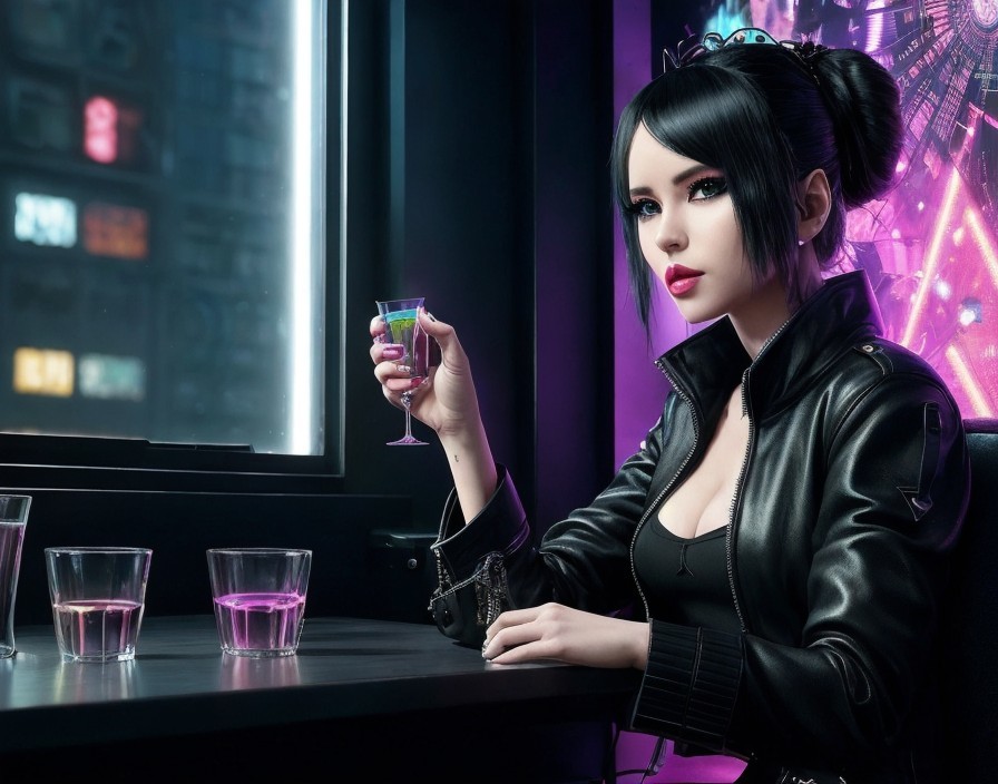 A woman with dark hair styled in buns is holding a glass of drink, wearing a black leather jacket, beside a bar with neon city lights outside.