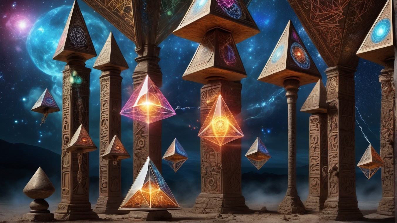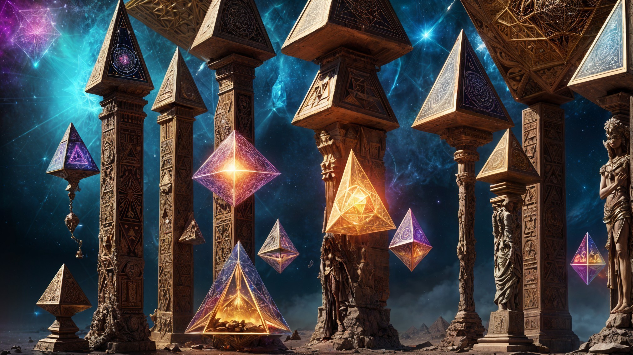 Glowing geometric shapes levitate among ornate pillars under a cosmic sky, creating a mystical, otherworldly ambiance.