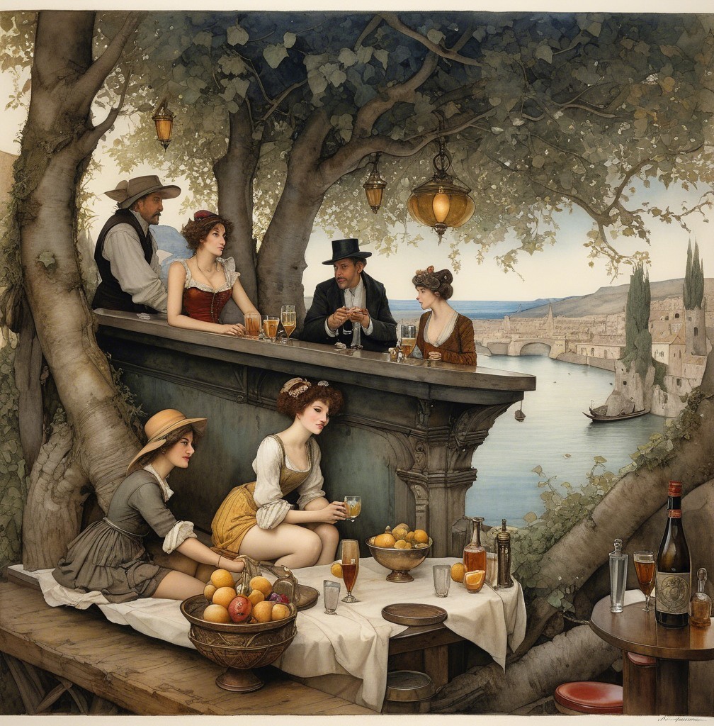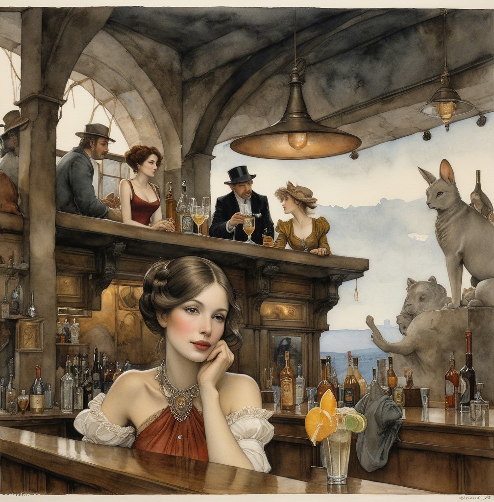 A stylish woman with long, wavy gray hair elegantly gazes at the viewer from a bar. Soft lighting highlights her features, and drinks are visible in the background, creating an inviting atmosphere.