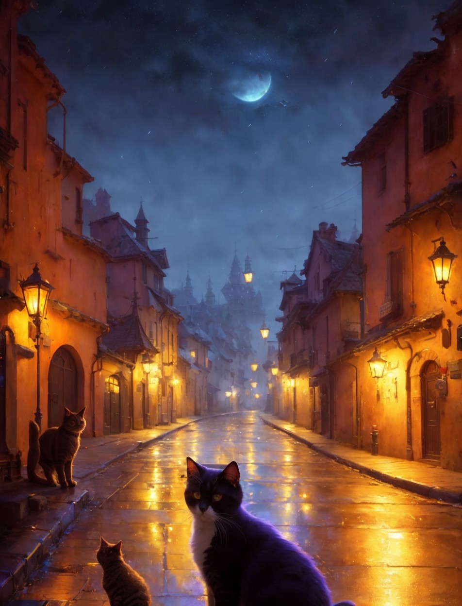 A cat sits on a rainy cobblestone street at night, lit by streetlamps under a crescent moon, with old buildings lining the road.