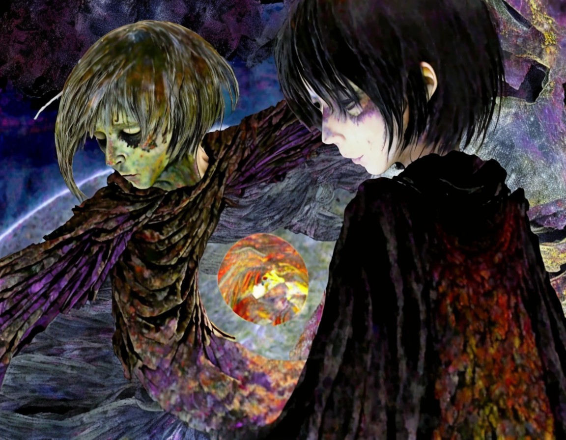 Two fantasy figures against a cosmic backdrop; one with a haunting gaze and birds, the other with intense eyes.