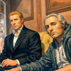 The image features two men sitting on a plush yellow couch, deep in thought. In the background, a glass display showcases a glamorous scene, adding an air of intrigue to the setting.
