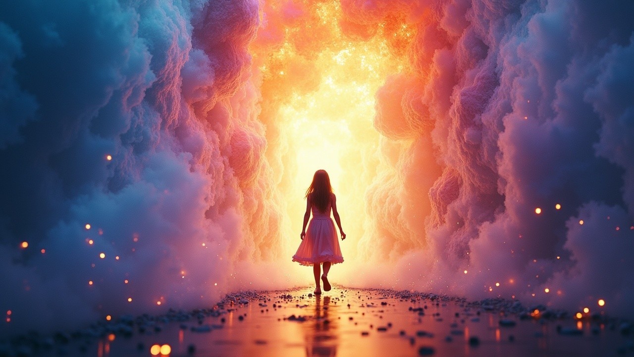A young girl walks towards a bright, ethereal light, framed by swirling, colorful clouds. The scene is magical and dreamlike, evoking a sense of wonder and exploration.