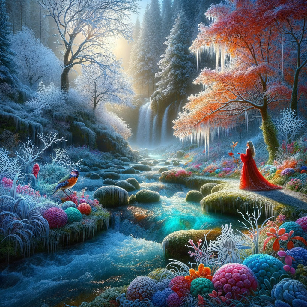Still the sunshine, sound of flowing stream, Cool breeze, A bird singing hymn, Thunderstorm, White landscape, surreal, thick snow. foggy forest in the background, Mystery, style by Thomas Wells Schaller, Maxfield Parrish and Ivan Bilibin, magical, elegant, beautiful, colourful, bioluminescent highlights and atmosphere, excellent quality, Daniel Merriam art station. Mystery. acrylic art, Art Deco, Annigoni, Egon Schiele, Botticelli, Catrin Welz-Stein, elegant, digital painting, concept art, smooth,Nikon D850 highly detailed intricate beautiful dynamic lighting imperial colors 3D Award winning photography fantasy 8k beautiful