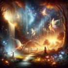 A mystical landscape features two enchanting castles surrounded by vibrant flowers, under a starry sky with swirling galaxies. A winding path leads through a dreamlike forest, evoking magic and wonder.