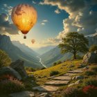 Two colorful hot air balloons float above a tranquil valley, surrounded by mountains. A winding river glistens below, while vibrant flowers and a solitary tree adorn the path ahead.