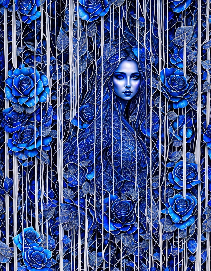Surreal portrait of a woman blending with vibrant blue roses and vertical lines