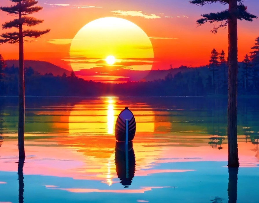 Tranquil lake sunset with pine tree silhouettes