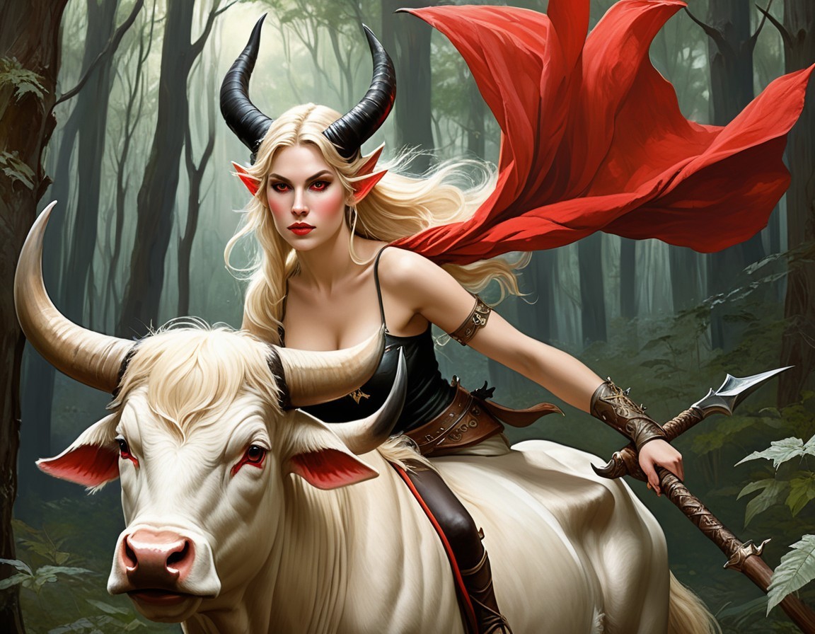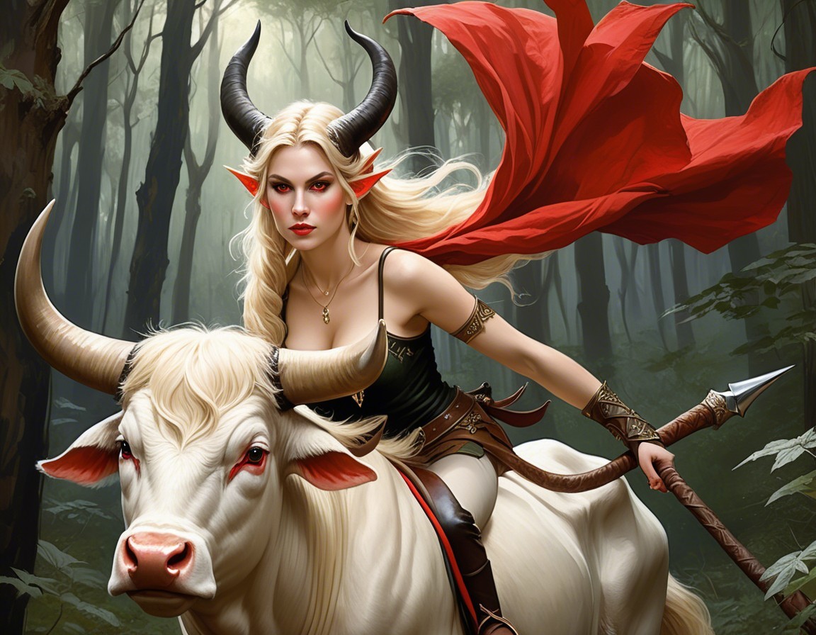 A striking fantasy scene featuring a beautiful elf-like warrior with horns, riding a majestic white bull in a mystical forest, adorned in a black outfit and a flowing red cape, wielding a spear.