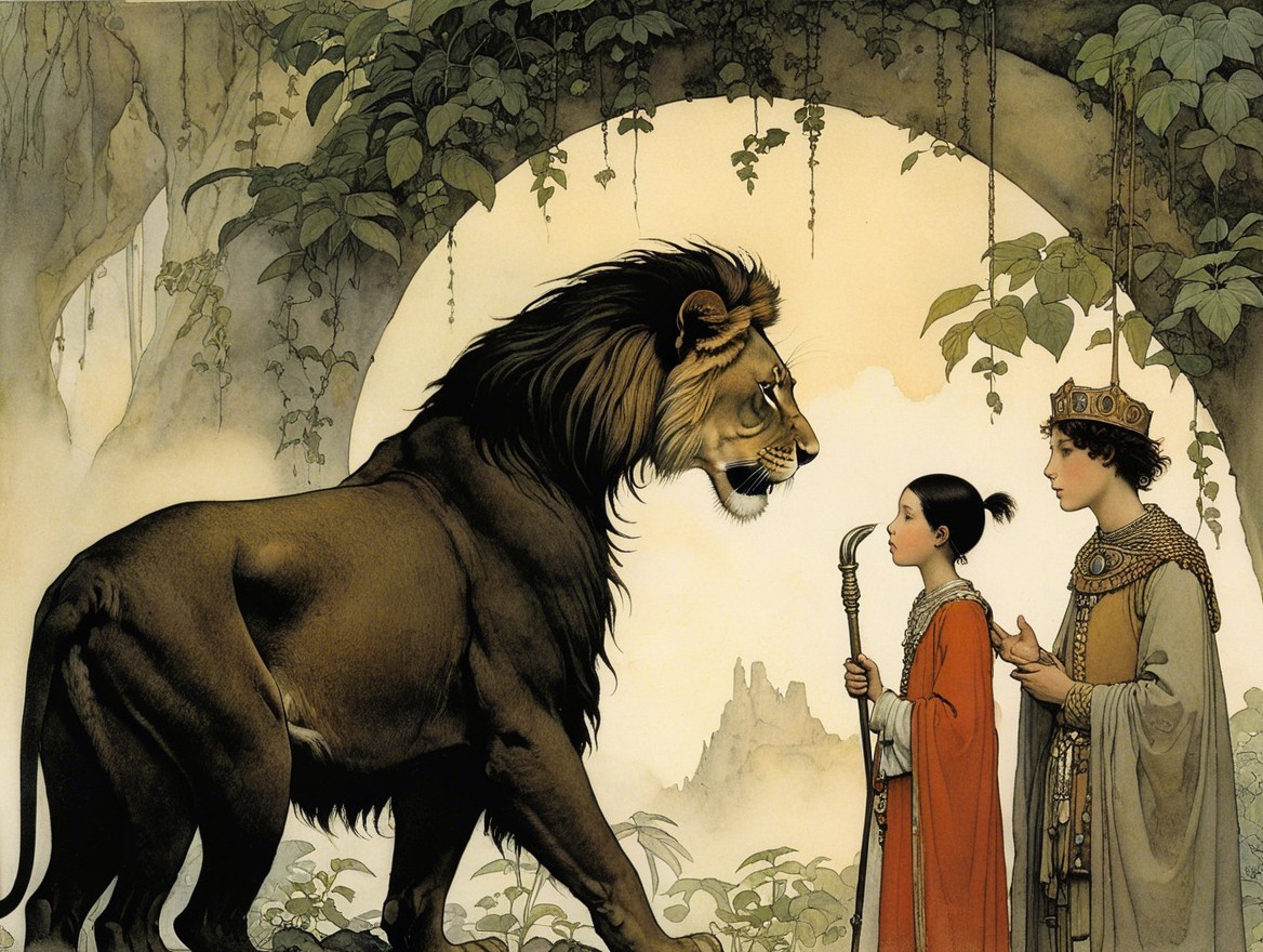 A young boy in a red cloak stands before a majestic lion in a lush, green forest. The scene captures a moment of wonder and connection between the two, framed by vibrant foliage.