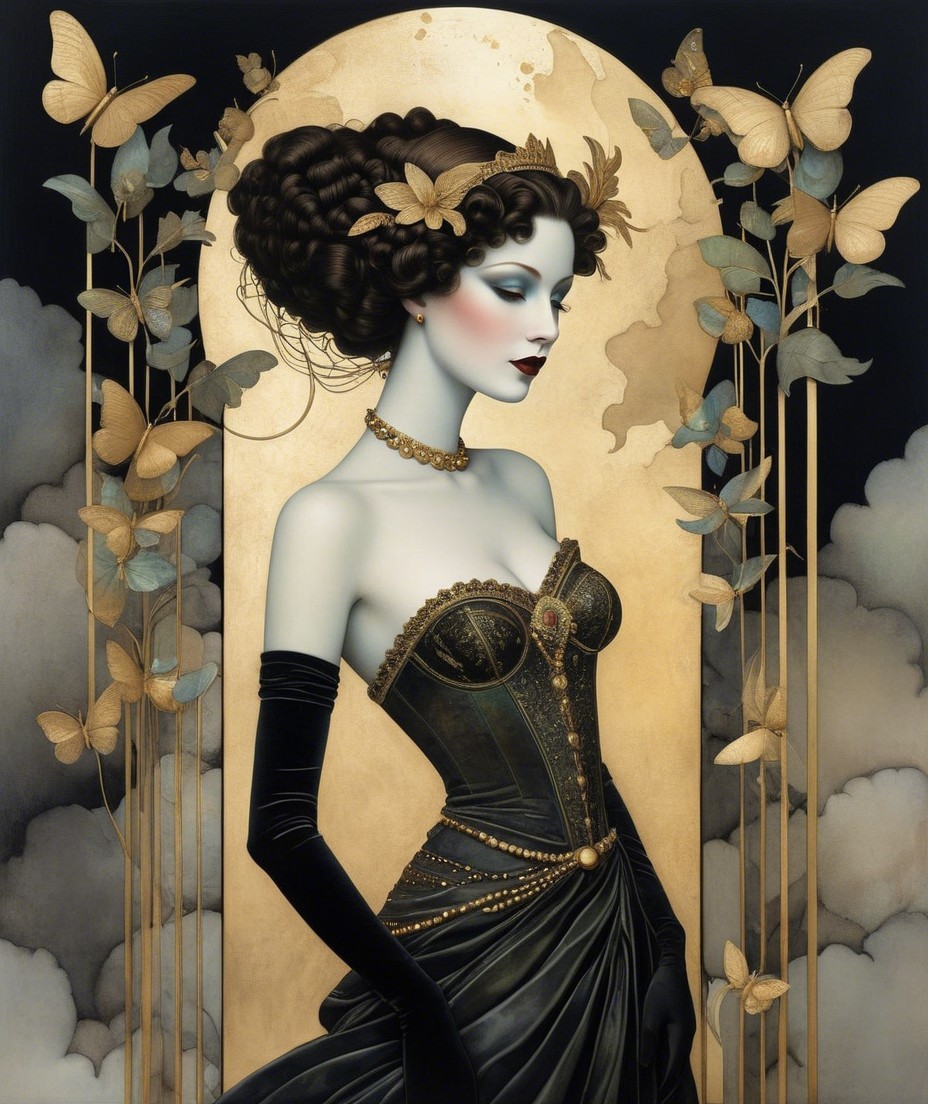 A graceful, elegant woman dressed in a dark, ornate gown adorned with jewels. Surrounded by soft clouds and delicate butterflies, she exudes a timeless, ethereal beauty.