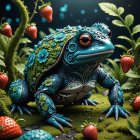 A surreal artwork featuring a person in a jacket, resembling a turtle, amidst vibrant red tomatoes and lush greenery, blending elements of nature and urban life in a dreamlike scene.