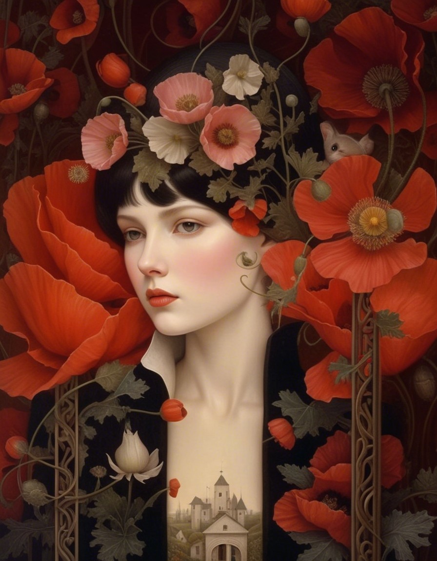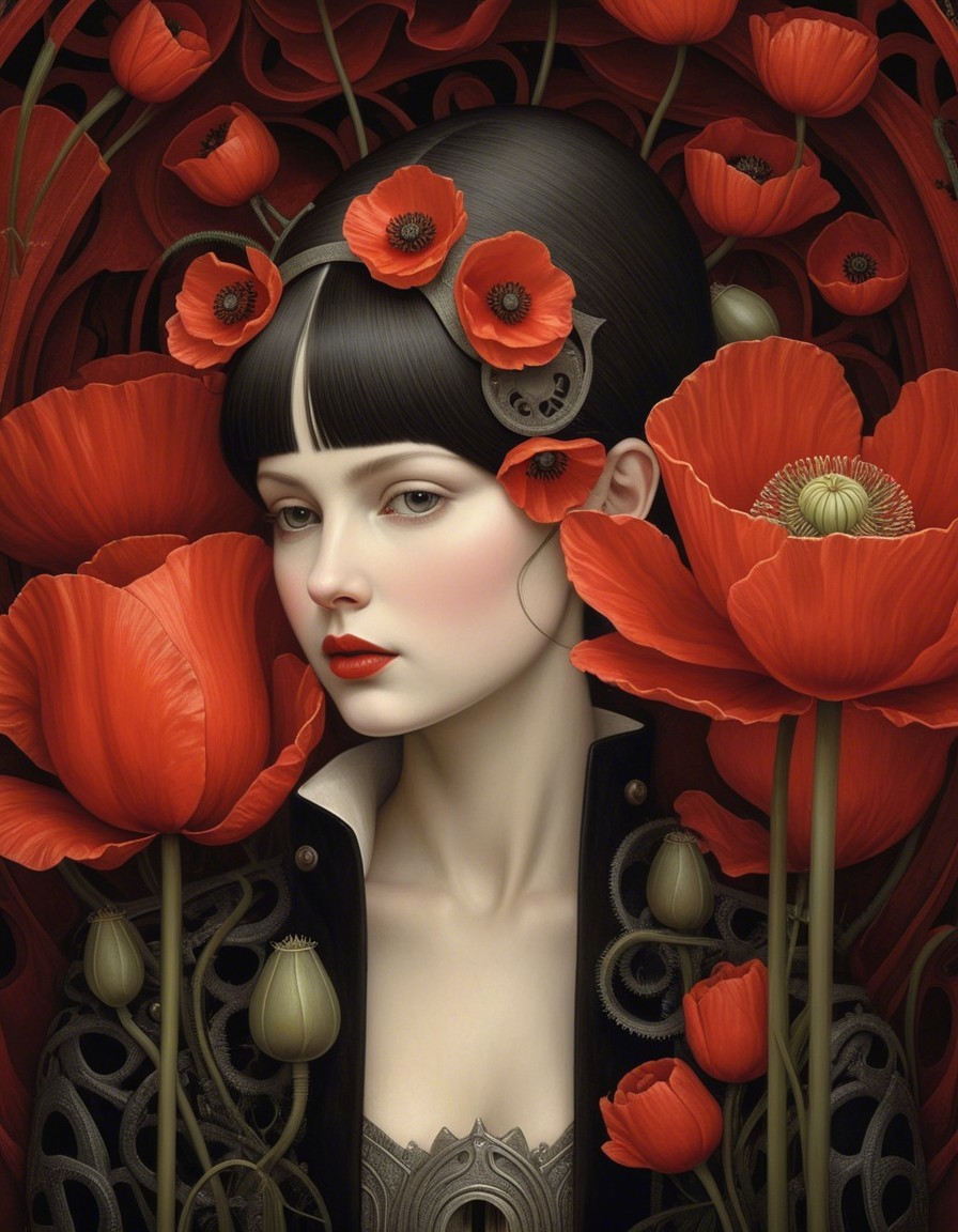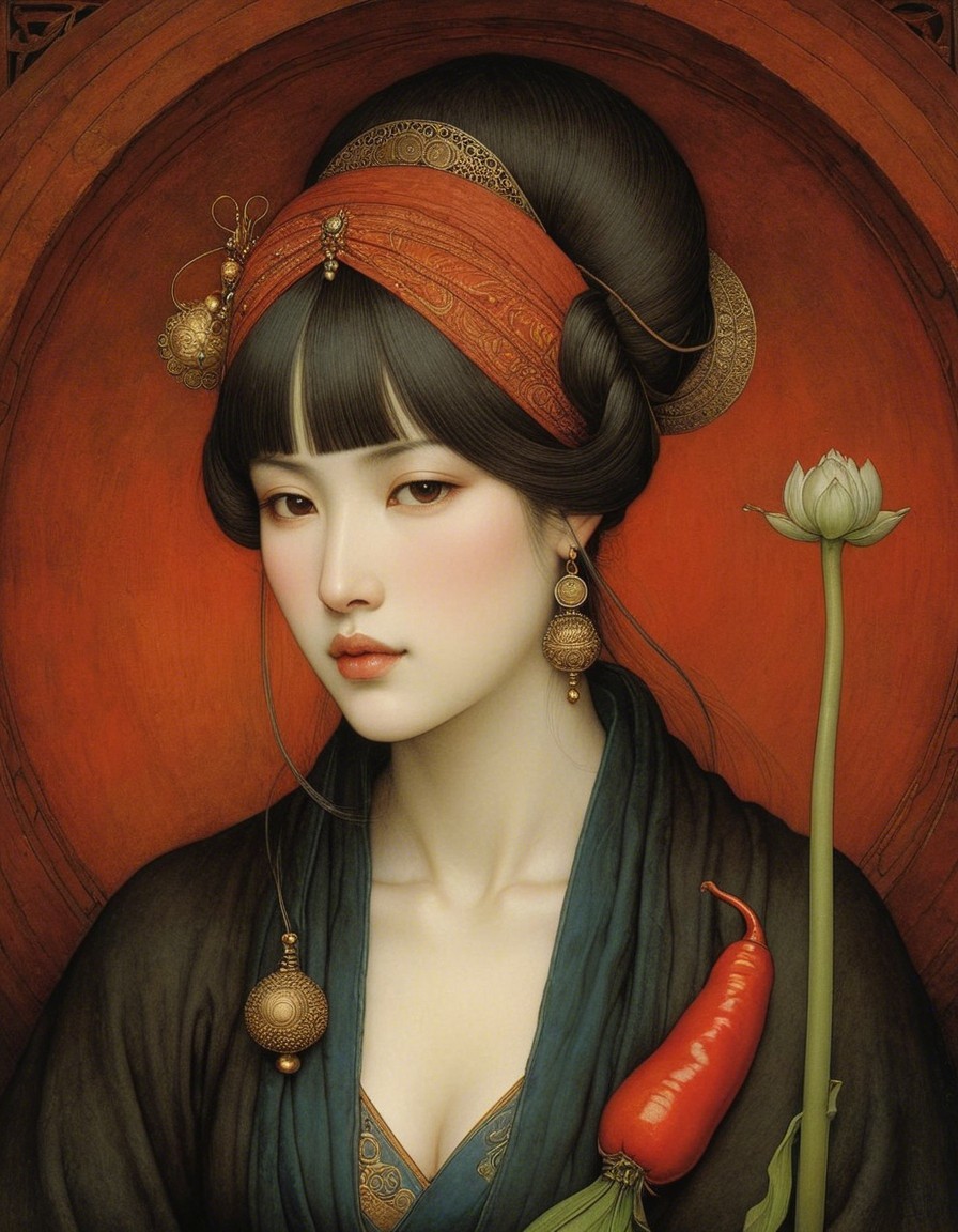 The portrait features a young woman with long black hair styled elegantly, adorned with a red turban and earrings. She wears a richly colored outfit and has red chili peppers as a striking accessory.