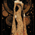 A glamorous figure in an ornate gown, featuring intricate floral patterns in gold and orange. Her elegant pose is complemented by an elaborate headdress against a dark, decorative backdrop.
