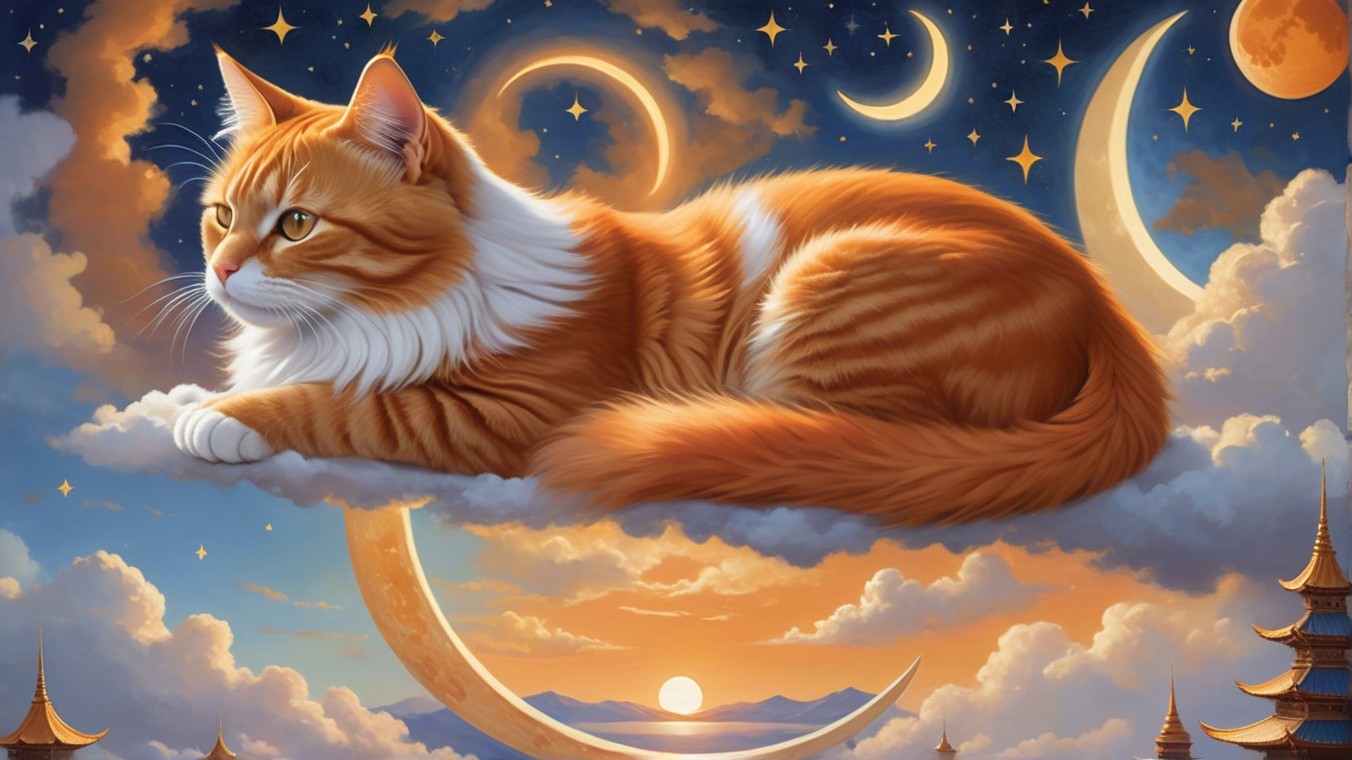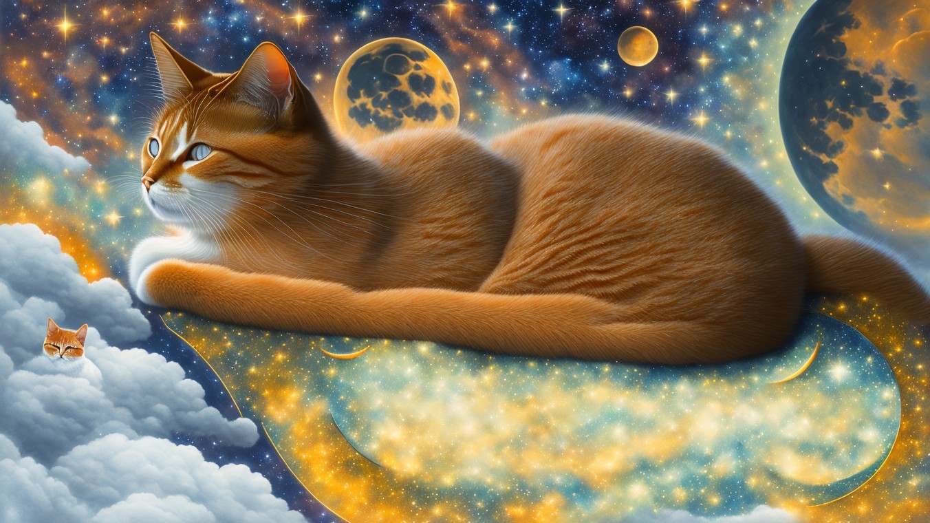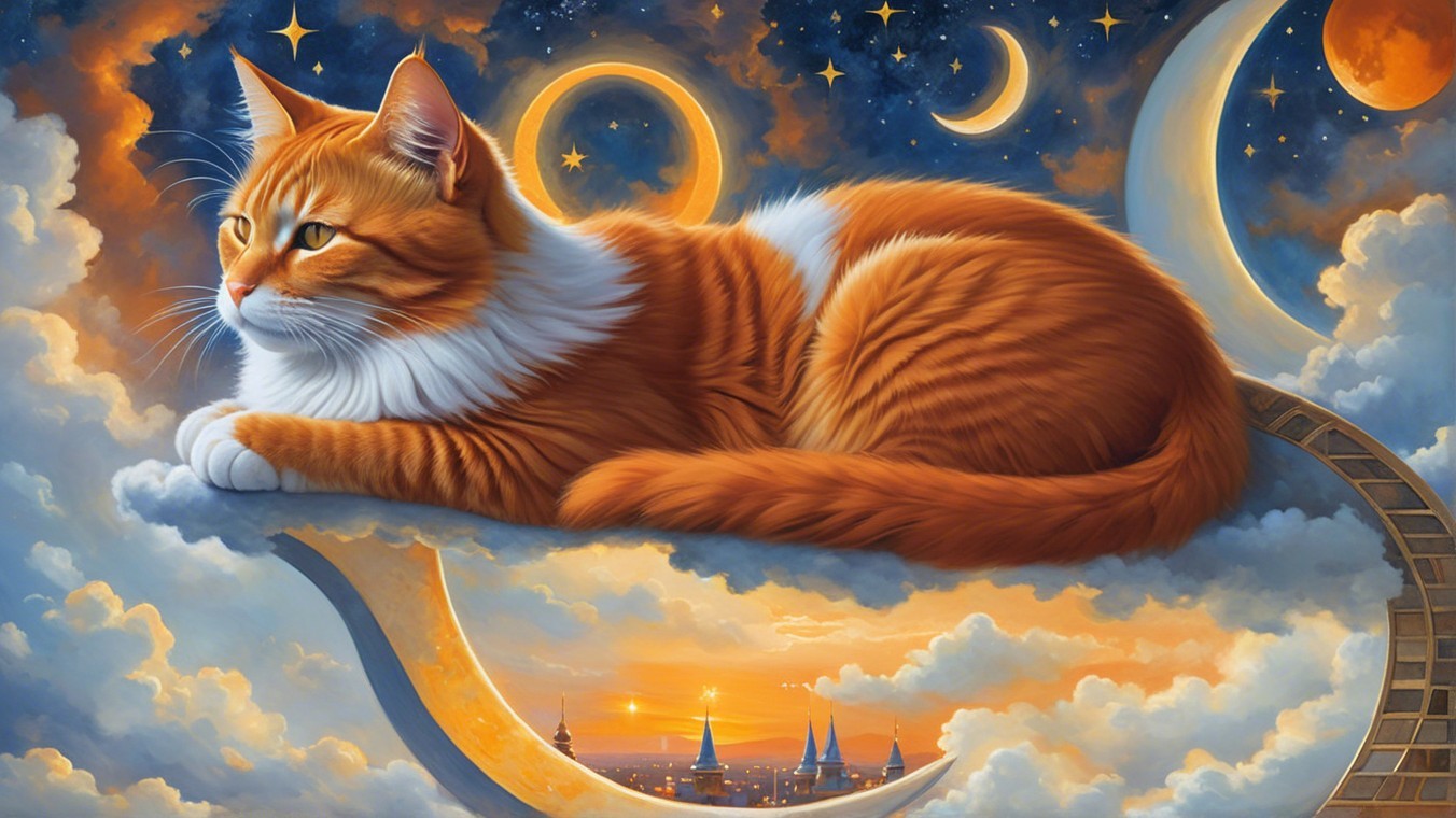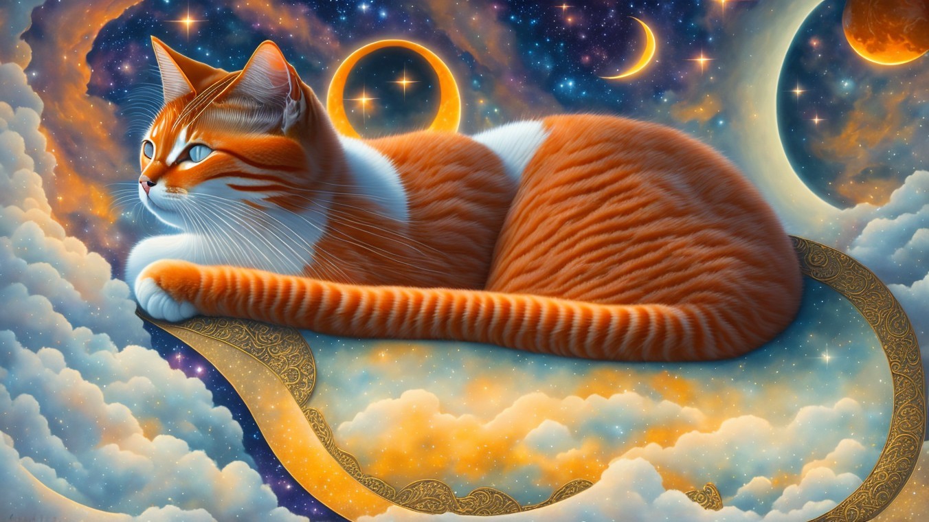 A dreamy orange cat rests atop a fluffy cloud under a cosmic sky, surrounded by stars and crescent moons, with a serene landscape below in warm twilight hues.