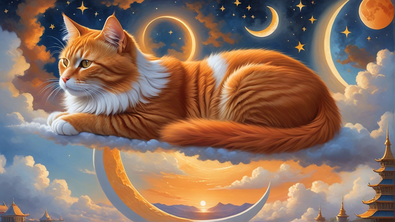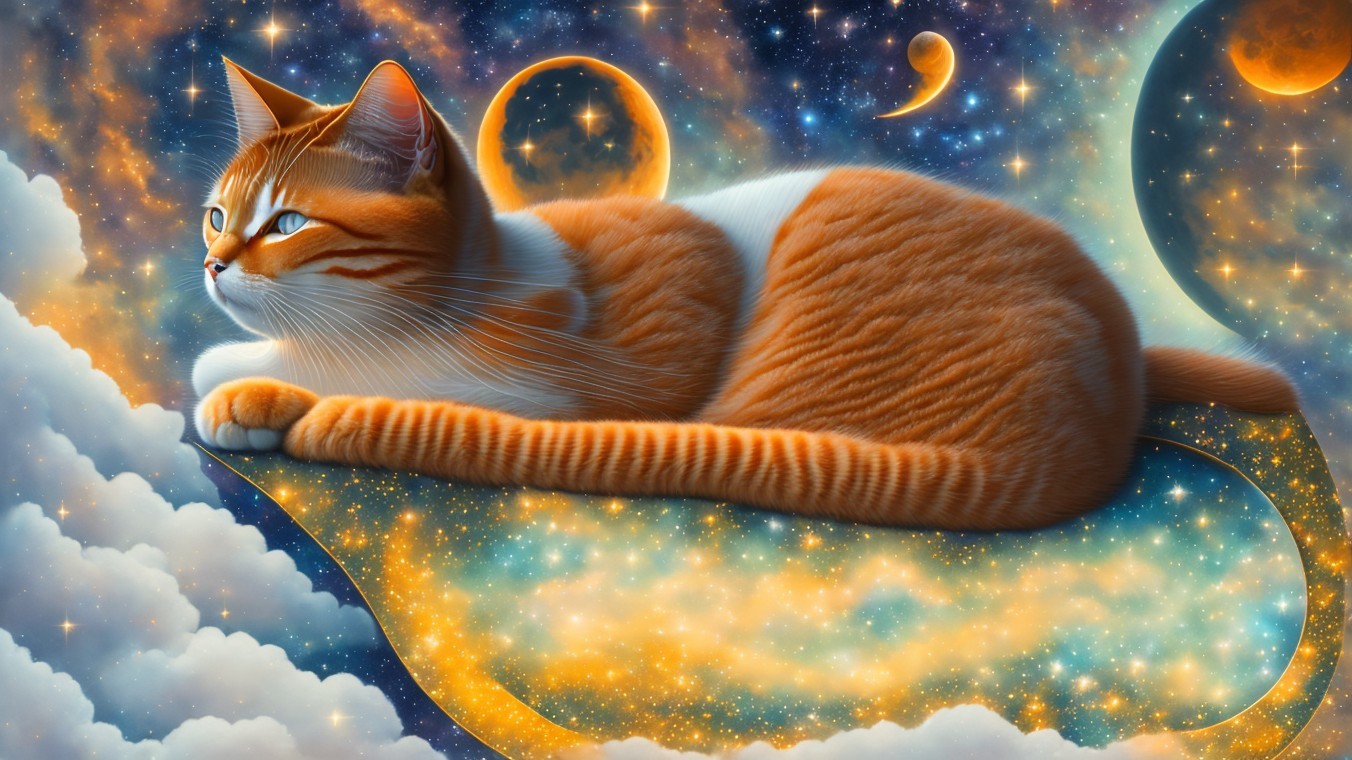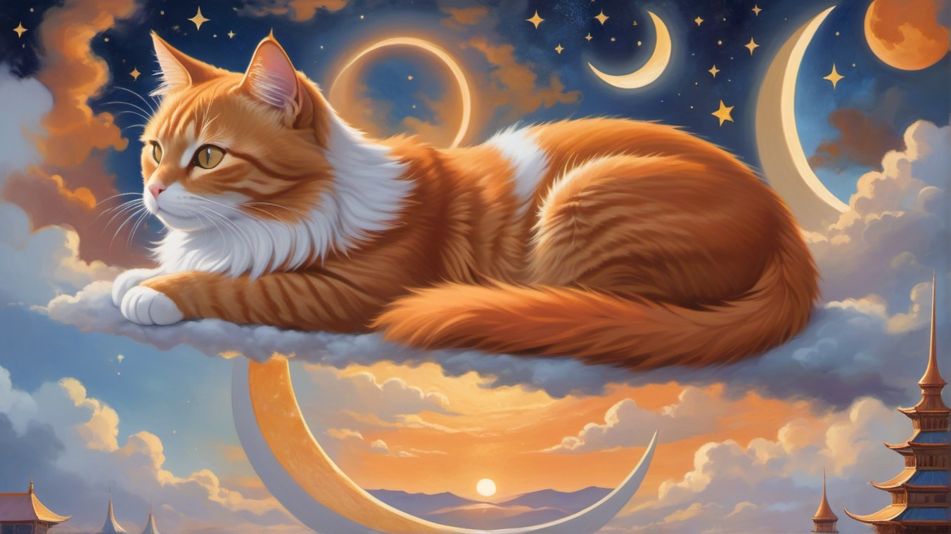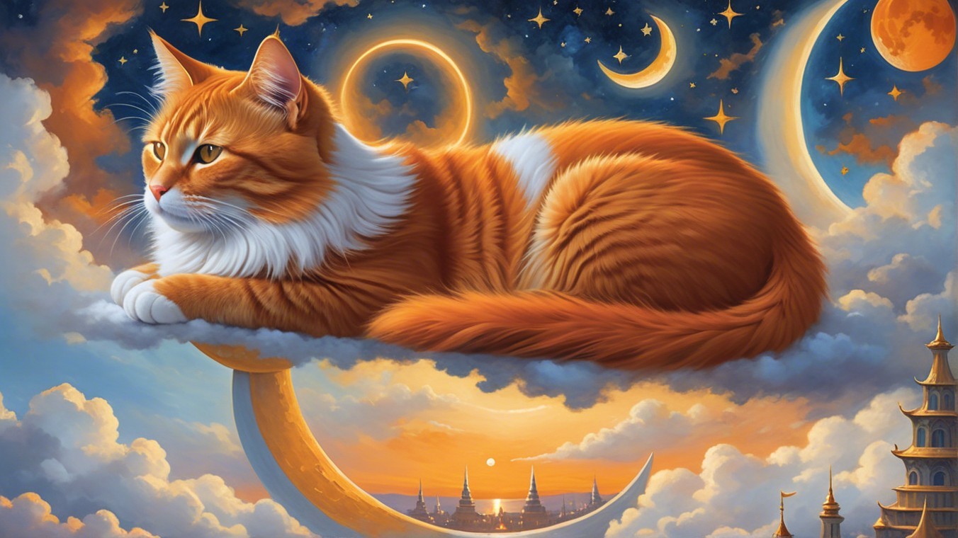 A dreamy orange cat rests atop a fluffy cloud under a cosmic sky, surrounded by stars and crescent moons, with a serene landscape below in warm twilight hues.