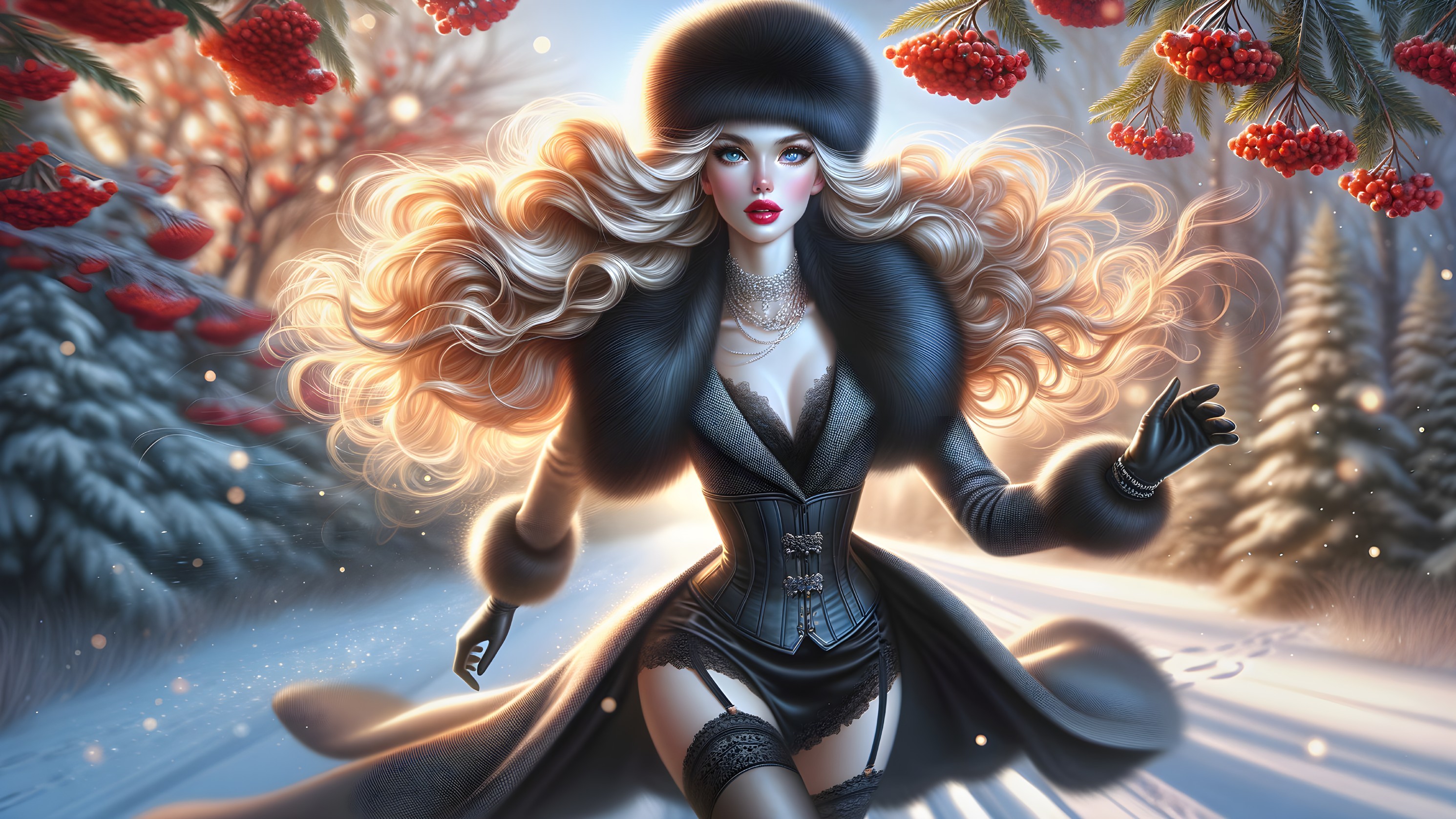A glamorous woman in a winter setting, wearing a luxurious black coat and fur hat. She has flowing blonde hair and striking makeup, with snow and red berries in the background.