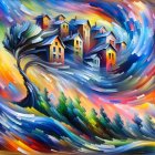 A vibrant, swirling landscape features a cluster of colorful houses atop a hill, surrounded by stylized trees, under a dramatic sky of bold blues, oranges, and purples, evoking a whimsical atmosphere.