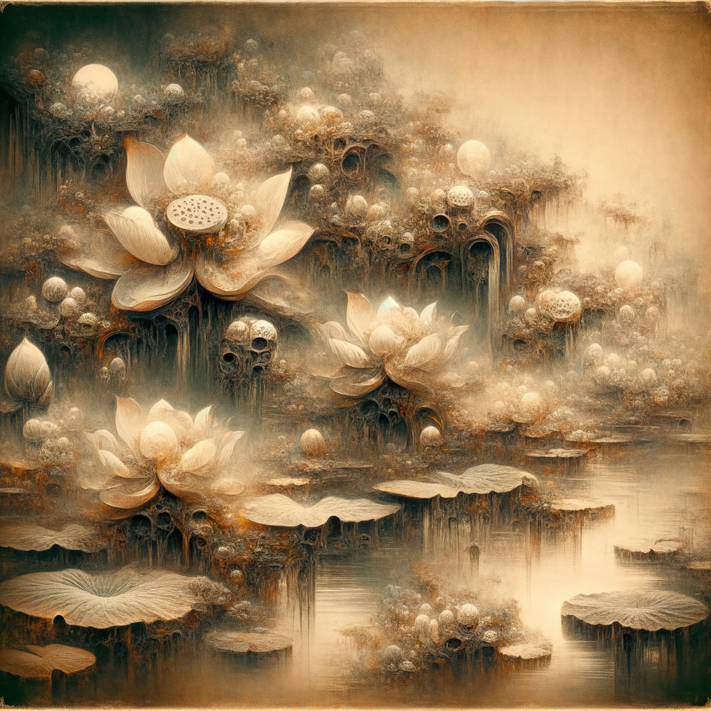 A serene landscape featuring elegant white lotus flowers rising from still waters, surrounded by lush greenery and shrouded in mist, with a soft sunset illuminating the scene.