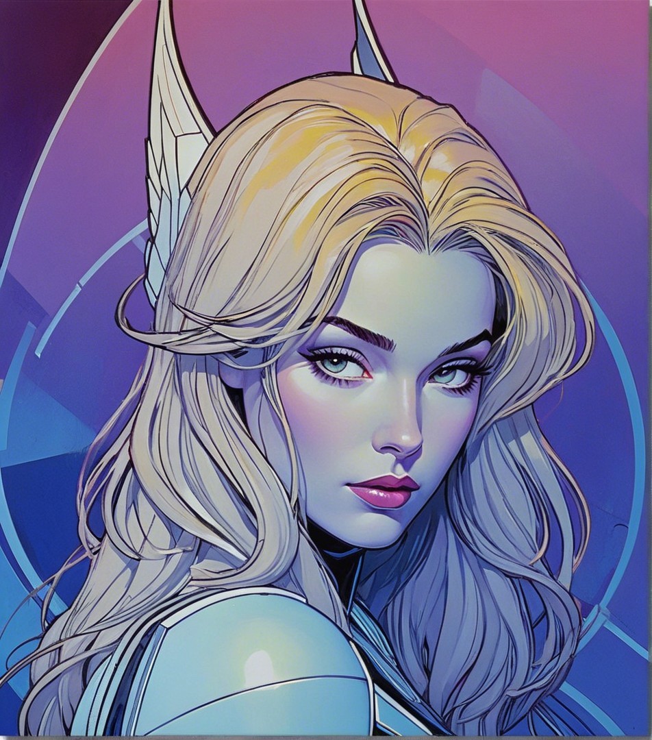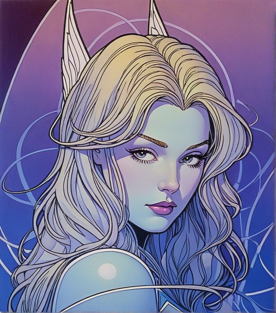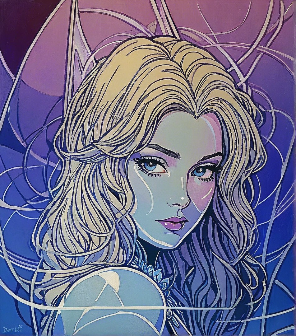 + Prompt:Marvel comic book art, 1990s animated female fantasy character, beautiful headshot, stylized, multi-layered line art illustration merged with Renaissance painting, style of pop art merged with lineage depiction, squiggly lines by Geof Darrow, contouring outlines by Georgia O'Keeffe, triadic color scheme blue white lilac, pastel colors of blue, 8k, RAW photo, mysterious enchantress with large hairstyle burst, hues, Marinism, bioluminescent eyes, warm tones, rim lighting, dark fantasy art, depth of field, eroticism, perfect handsface, symmetrical, somber, softened patterned lighting, american gothic 1.3, tetradic color scheme beige blue white lilac, ambient occlusion 1.7, octane render illustration, layered geometrical vector art, luminosity 1.8, radiance, abstract, muscular, sculpted, baroque, simplistic, sensible, radiance, traumacore 1.7, octane render illustration, anisotropic filtering 1.7, dynamic lighting 1.7, colored line drawing, style is reminiscent of space age style, coherence by DejahThoris, visible brushwork, gradient colors, golden ratio, colorful foampunk, traumacore 1.2, overall composition by Georgia O'Keefe and Susan Seddon Boulet and Barbara canepa and Overton Loyd, juvenile, serene expression by kate greenaway, beautiful composition, inviting mood, soft blending of hues, intricate splashed inkpunk, reminiscent of watercolor and aquarelle style, overall stylized illustration by Jay coby and Georgia O'Keeffe and Overton Loyd