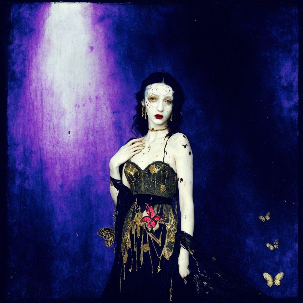 A striking portrait of a woman in an elegant dark gown adorned with gold patterns and a butterfly motif. She poses against a deep purple backdrop, with a mystical and ethereal vibe.