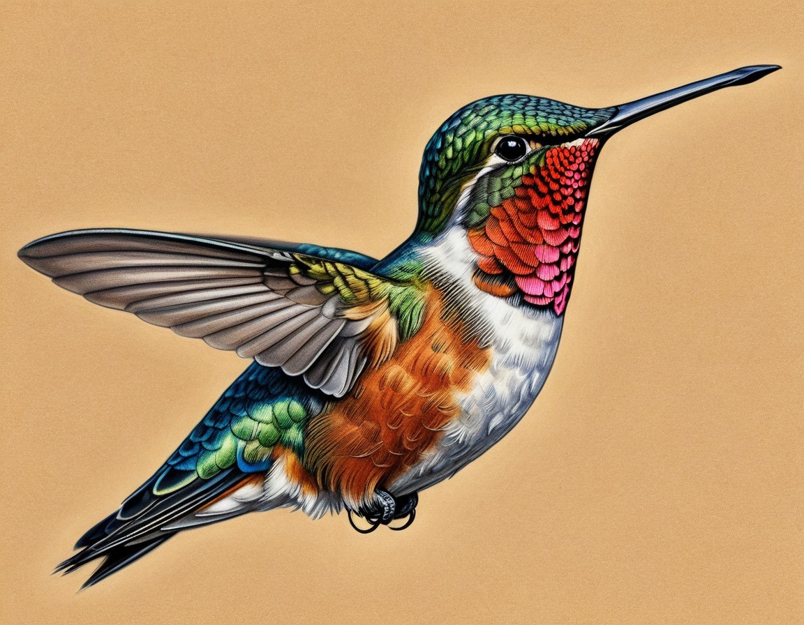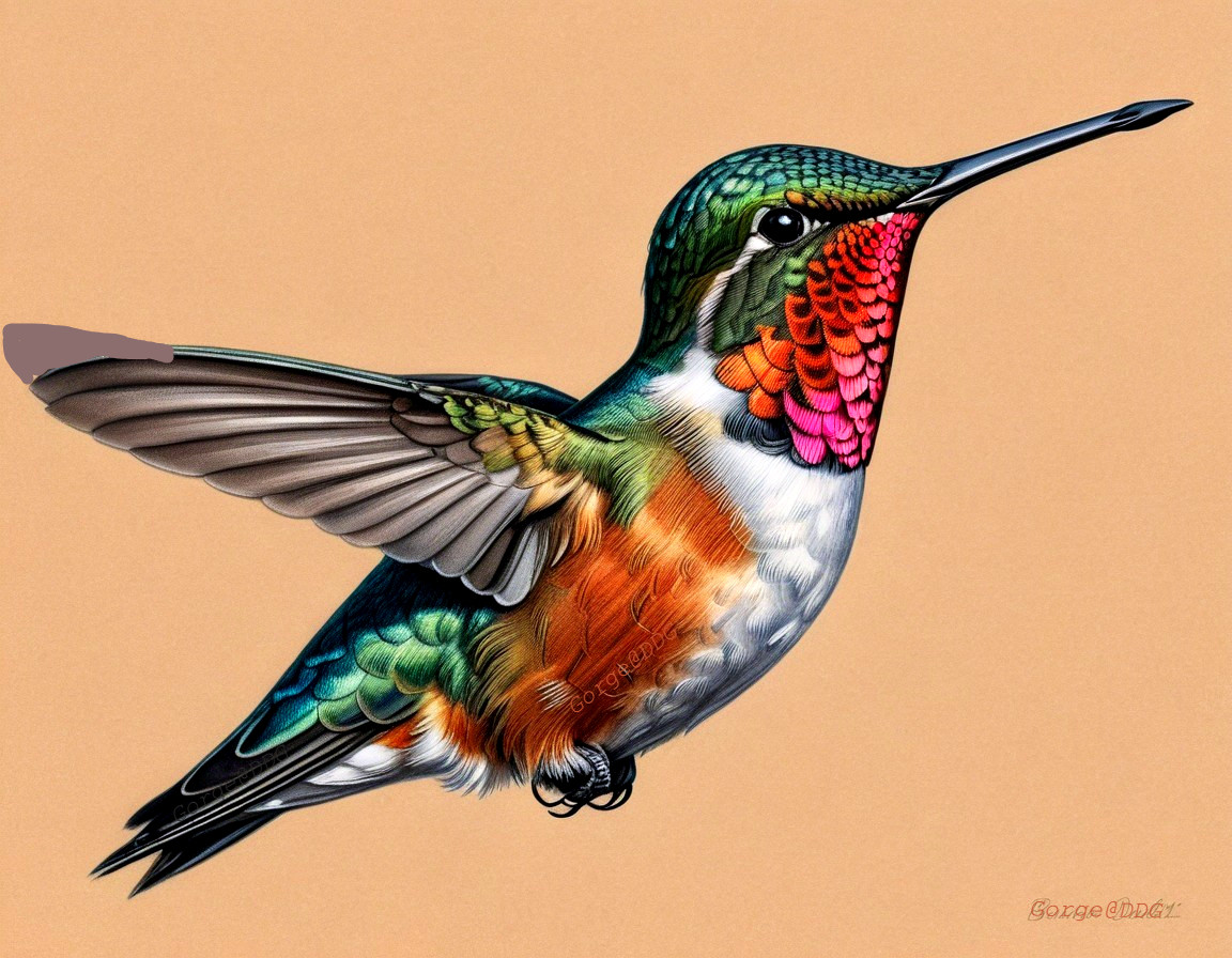 A vibrant hummingbird in mid-flight, showcasing iridescent feathers in shades of green, pink, and orange against a soft beige background. Its wings are gracefully spread, highlighting its beauty.