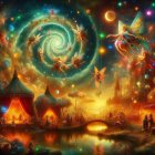 A whimsical castle stands under a swirling starry sky, with vibrant trees and blooming flowers. A serene river meanders nearby, illuminated by glowing lanterns and a crescent moon above.