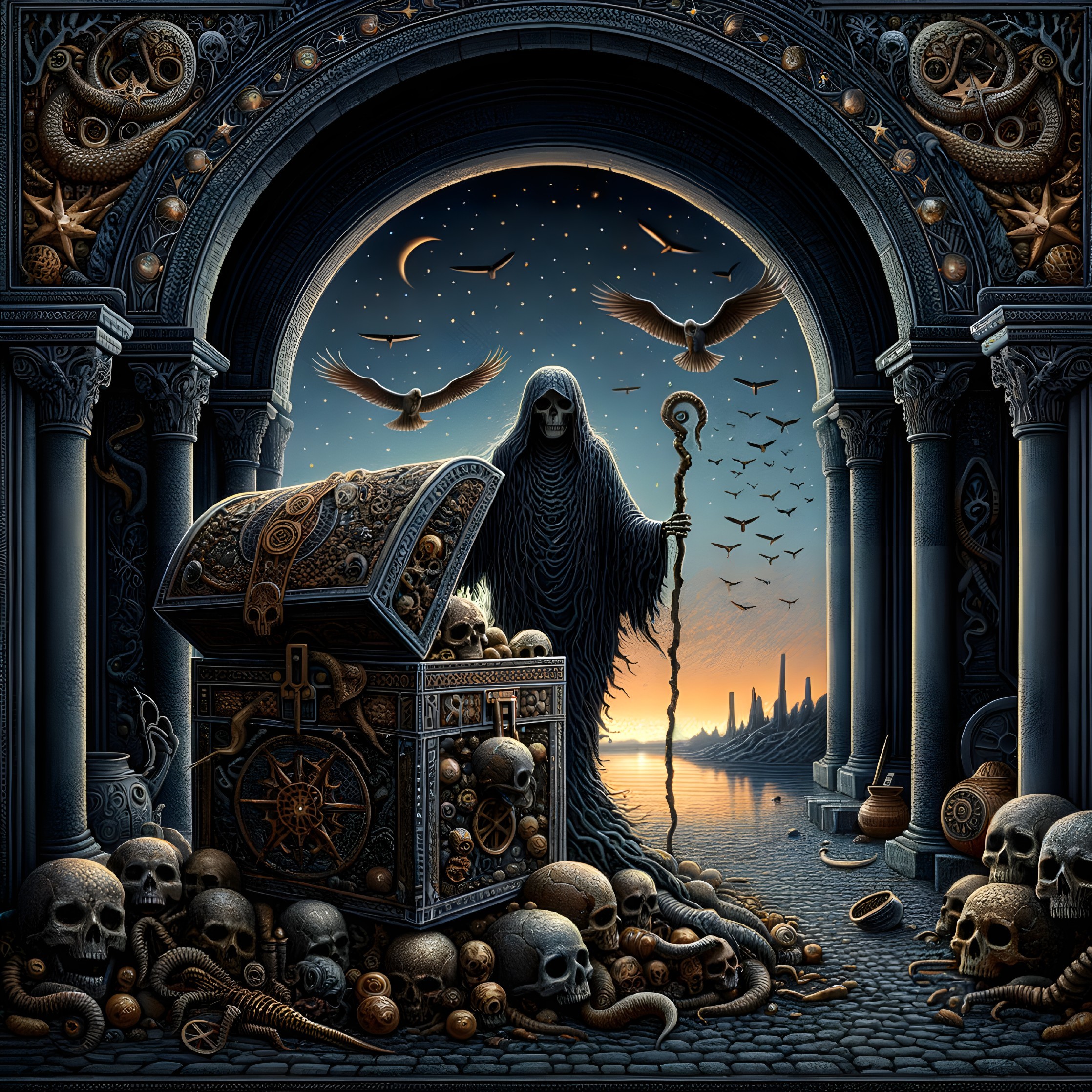 A cloaked figure stands before a treasure chest overflowing with skulls, under a starry sky. Dark arches frame the scene, with eerie shadows and distant land and birds in the background.
