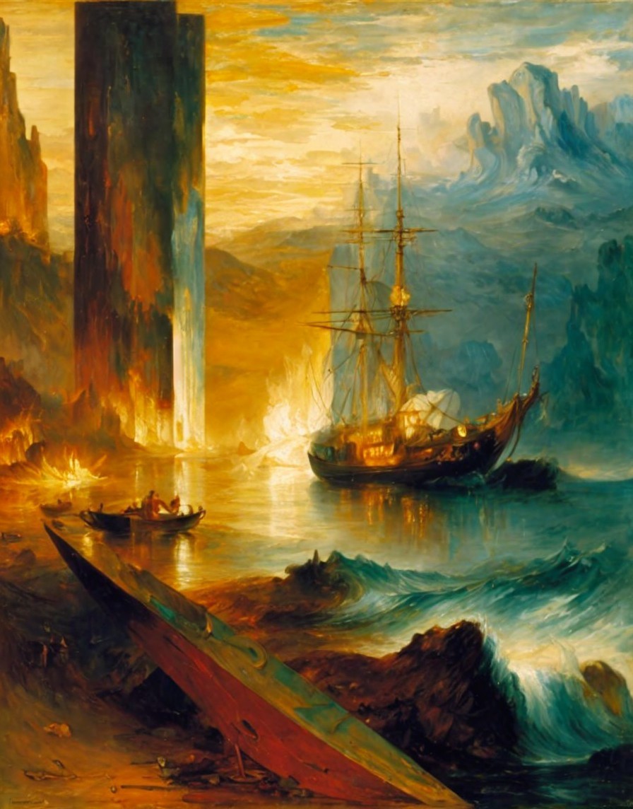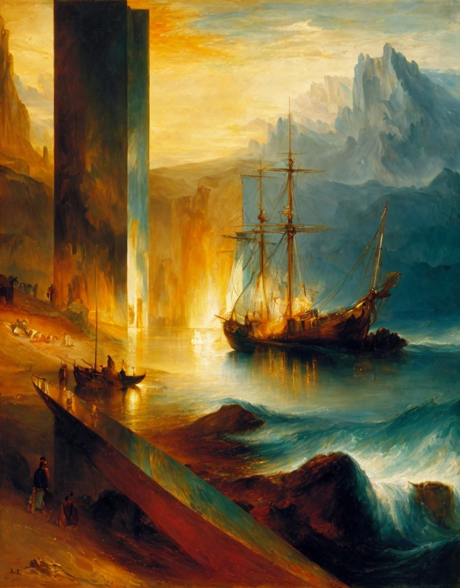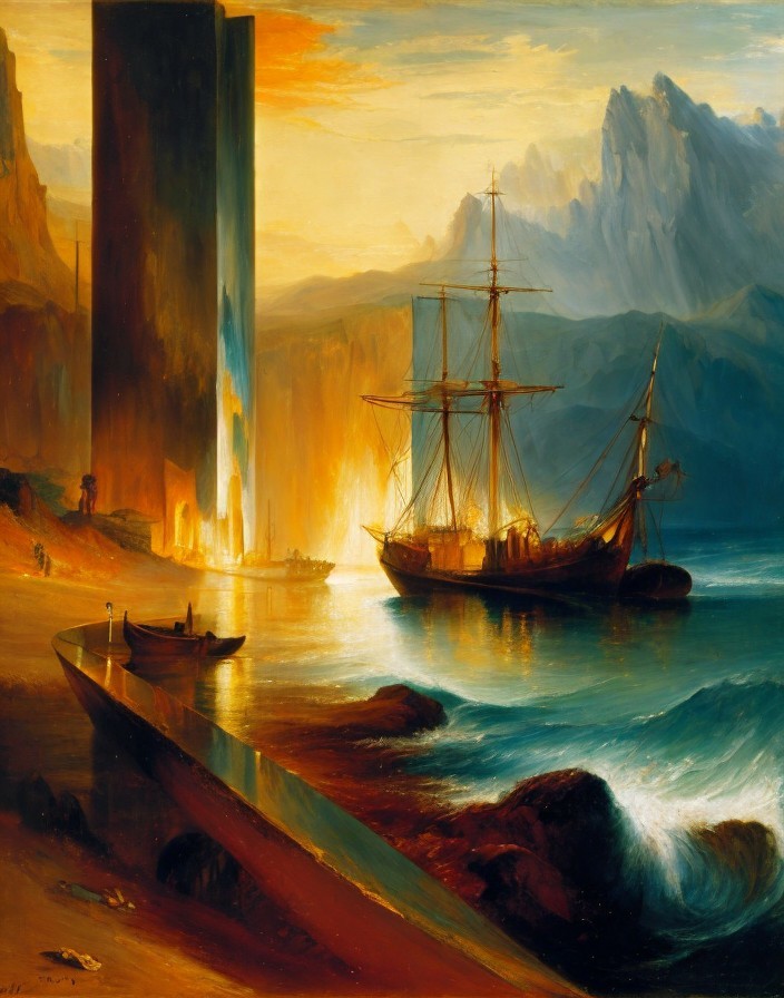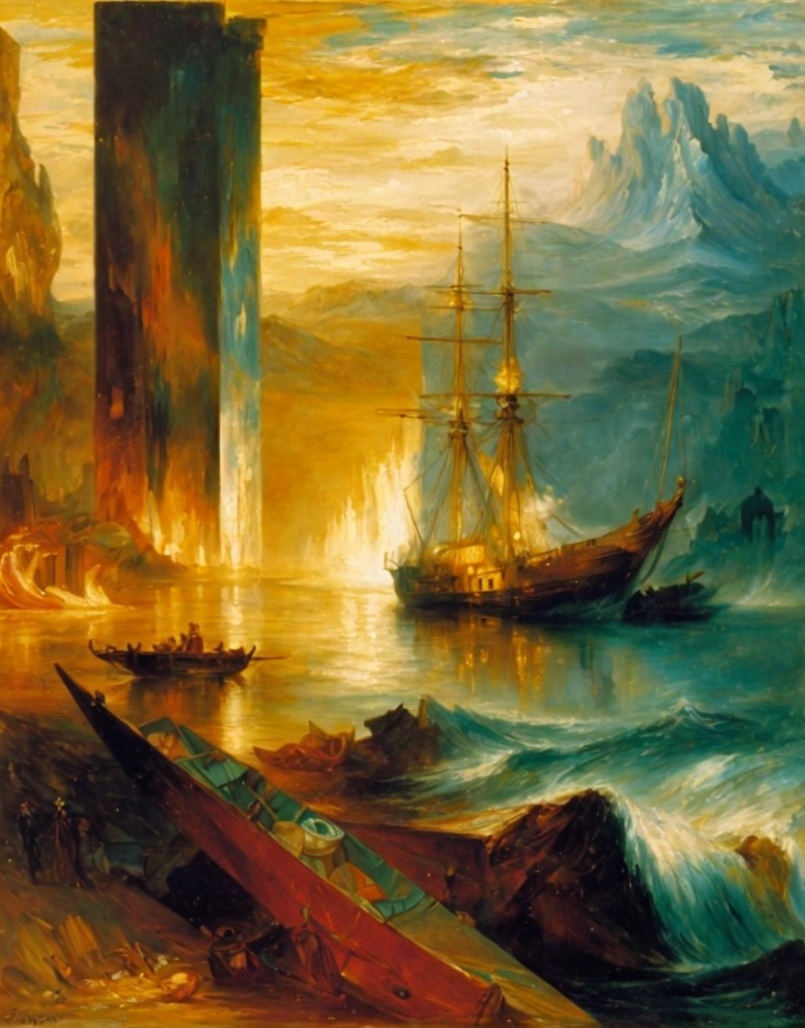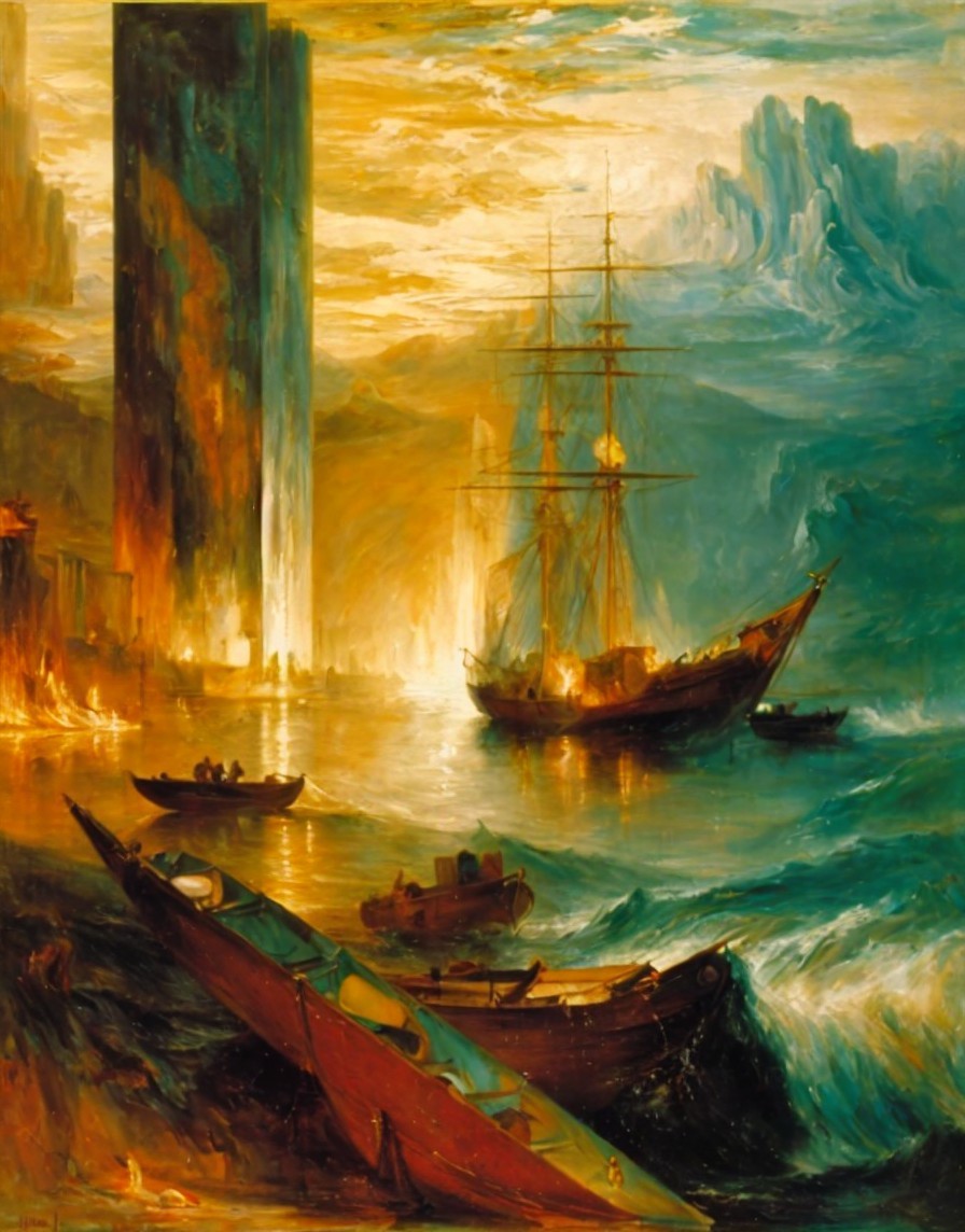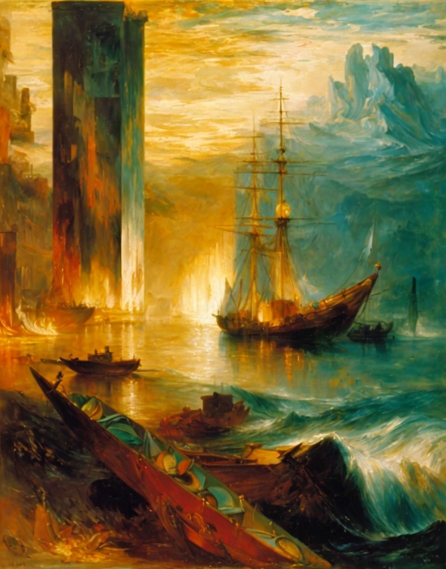 Vibrant seascape painting with ship, boats, and dramatic sunset sky