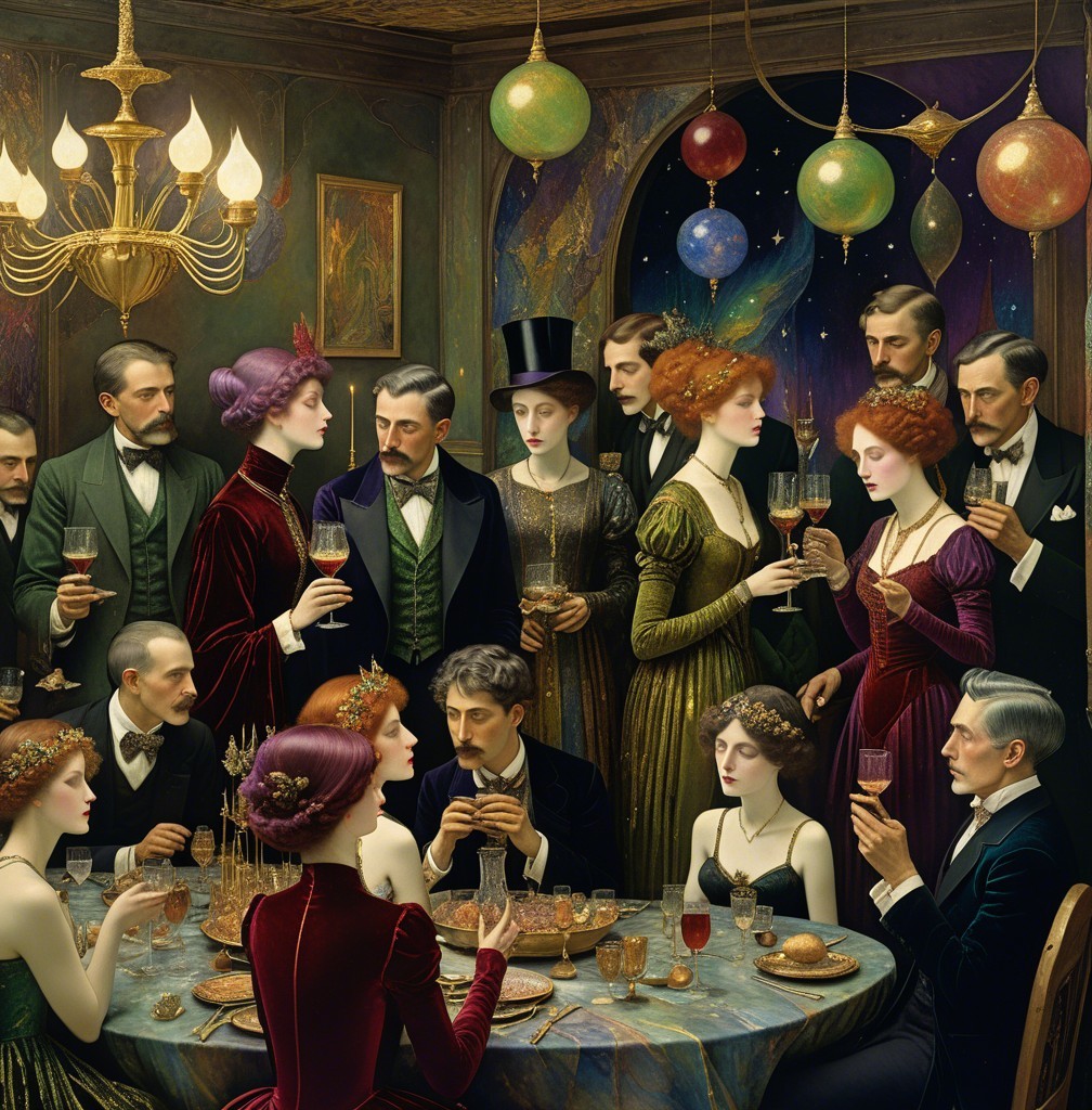 A lavish gathering of elegantly dressed men and women, holding glasses in a richly decorated room. Colorful orbs illuminate the scene, highlighting the intricate clothing and ornate tableware.