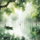 A futuristic, glass-walled eco-home sits on a tranquil island, surrounded by lush green trees and mist. Reflections shimmer on the still water, creating a serene, dreamlike atmosphere.