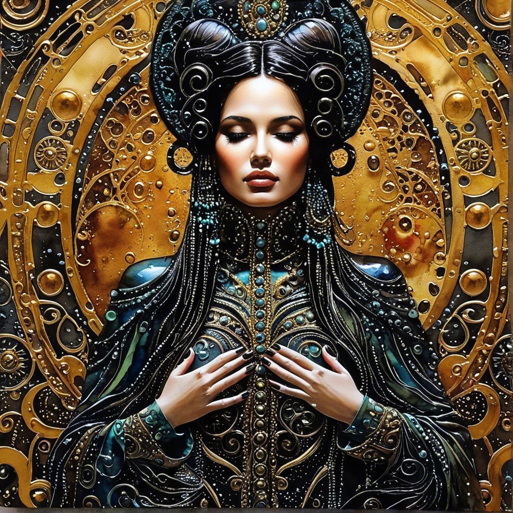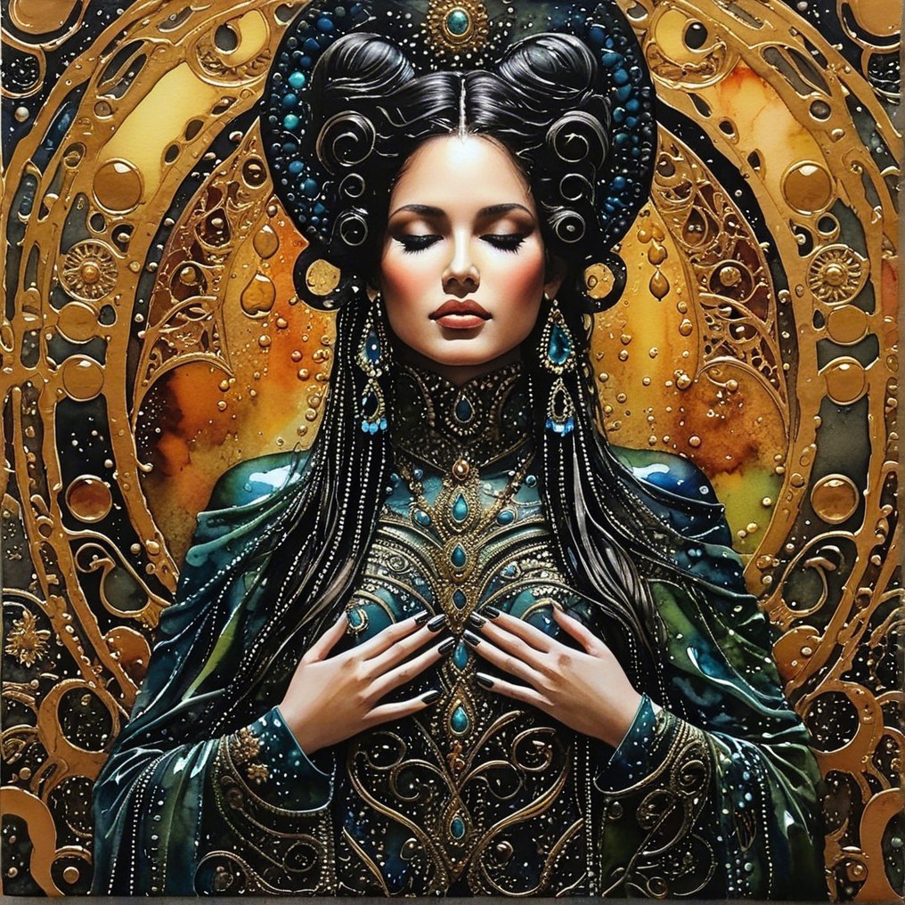 Serene Woman in Ornate Green Gown with Mystical Aura
