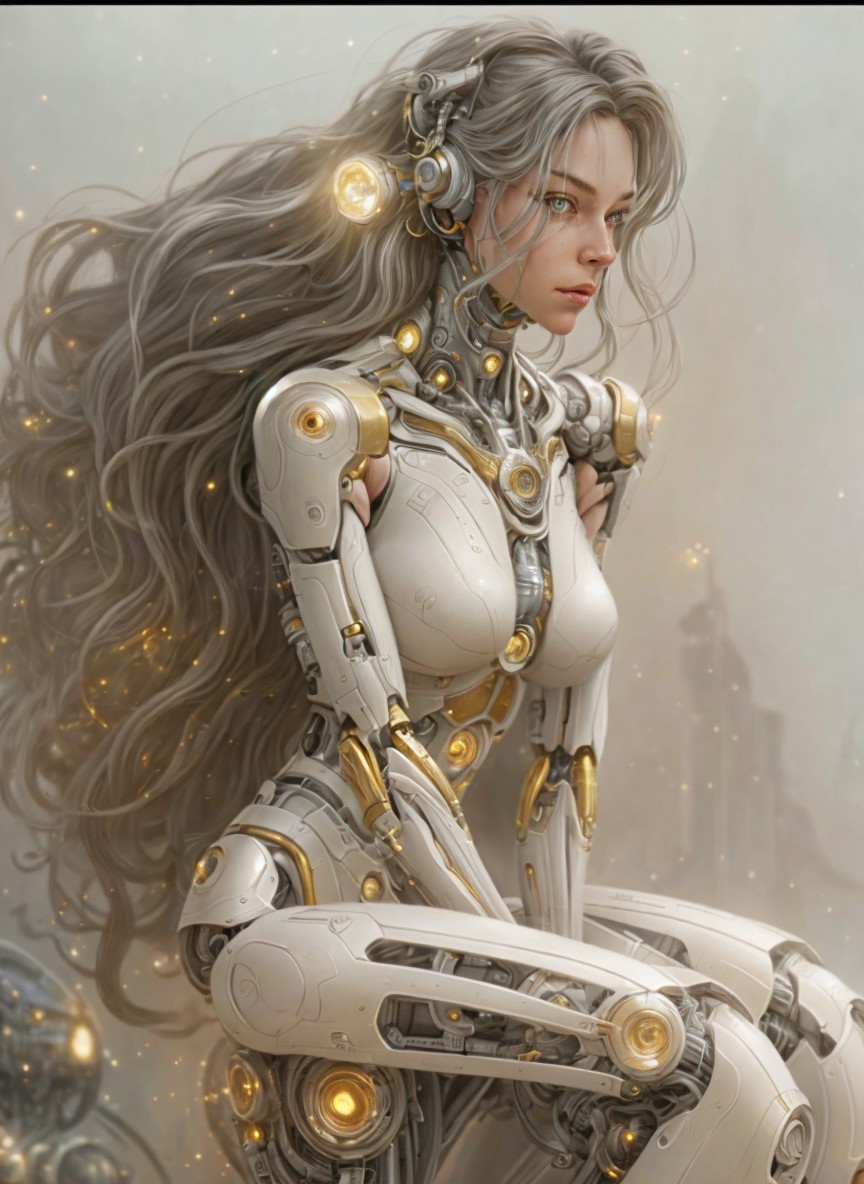 + Prompt:Full body Female cyborg, beautiful human face, grey very long wavy nappy hair Metal and Gold armor with skin showing background science fiction machines by Jean-Baptiste Monge and Erin Hanson