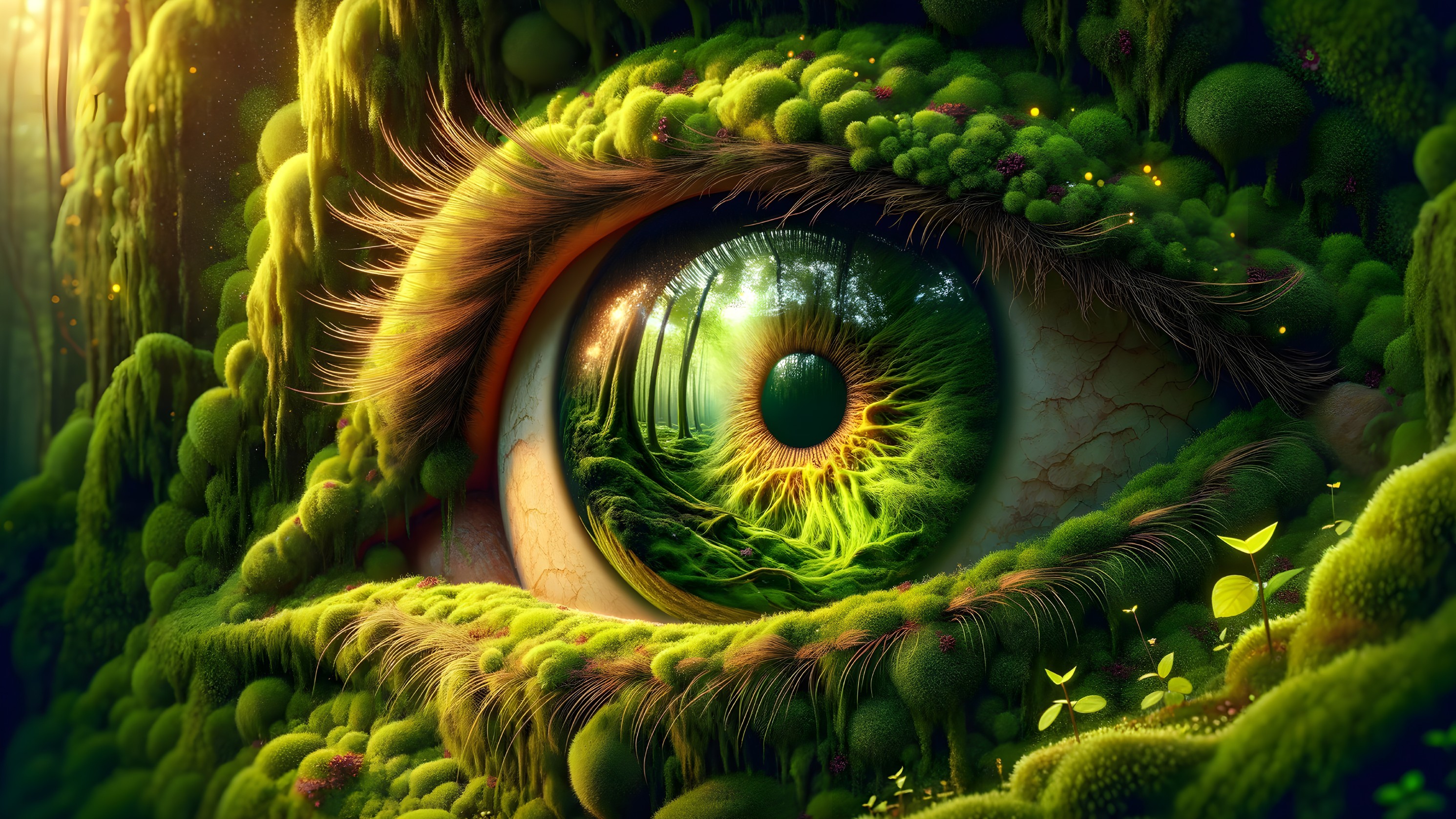 A stunning, hyperrealistic depiction of an overgrown forest eye, intricately detailed with vibrant moss. The masterpiece features a captivating reflection, enhanced by HDR and depth of field effects.