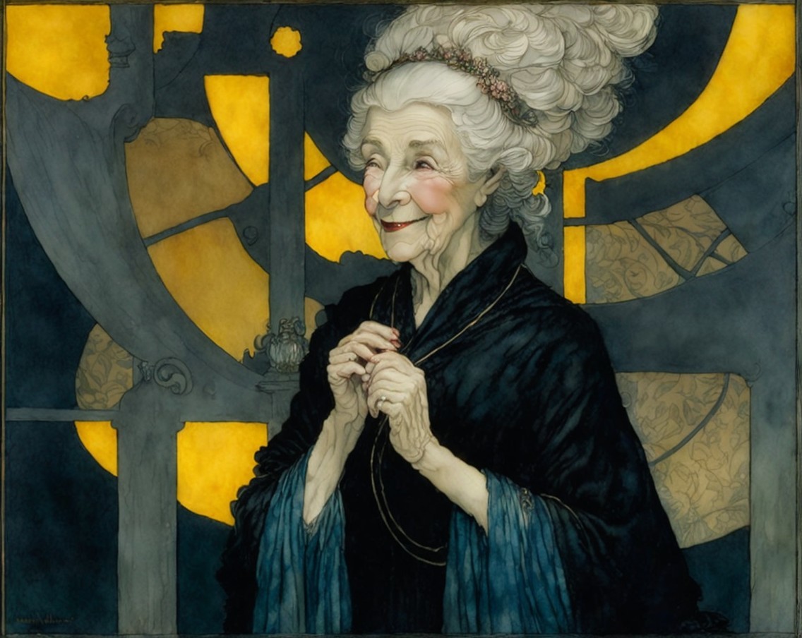 The image features an elegant elderly woman with a charming smile, adorned with flowers in her hair, set against a vibrant yellow background filled with decorative pottery and fruits.