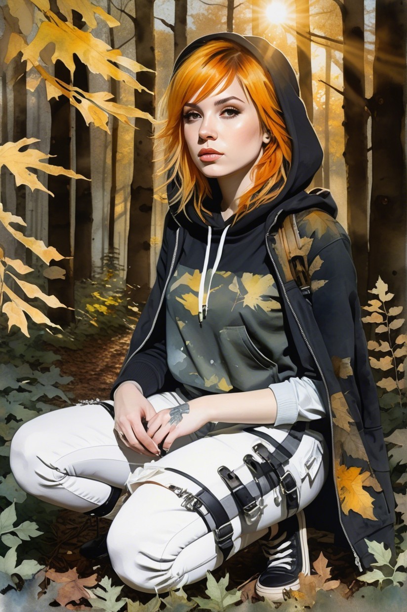 Pen and ink sketch with overlaying transparent layers, 3D effects, hies, wide-angle, grungy watercolor and ink merged with pen and ink, oveespray of paint, blotting, punk rock girl kneeling in forest, foliage, golden crepuscular sunrays filtering through the canopy of an autumnal oak and birch forest, fine watercolor and ink strokes, color glitch, 135mm photography, dethereal, xeroxed, cel-shaded, dethereal, panavision, filmed with Ilford Sprite 35-ii Reusable camera, push processing, Sepia tones, weathered oak and birch trees with branches under the pale yellow autumn sun, vibrant red leaves and foliage carpeting the forest floor, cheerful autumn scene, luminal soft parametric light and shade extension, transpositional invisible aperture, soft filled backlighting. back-lit. Dreamscape, traumacore 1.9, Enhanced according to light source, color glitch, ominous light beams, flamboyant light beams, sun rays, detailed face, dark hooded cloak, estranged metallic colors, gradient light transitions, squiggly lines, plasticity 1.6, octane render, uhd, hdr, 64K, parallax occlusion 1.2, anisotropic filtering 1.7, raytraced shadows 1.8, high coloring 1.9, overall composition by Georgia O'Keeffe and Susan Seddon Boulet, sawtooth wave, Negative Lucas numbers, Digital topology, LiDAR point cloud, precise Gelsculpt 4k, Novelty architecture,Legit emotional reactions, perfect body coordination, perfectly flowing emotions, perfectly resonated aesthetics, actual realistic image of motion, Representation With Expressive Marks,