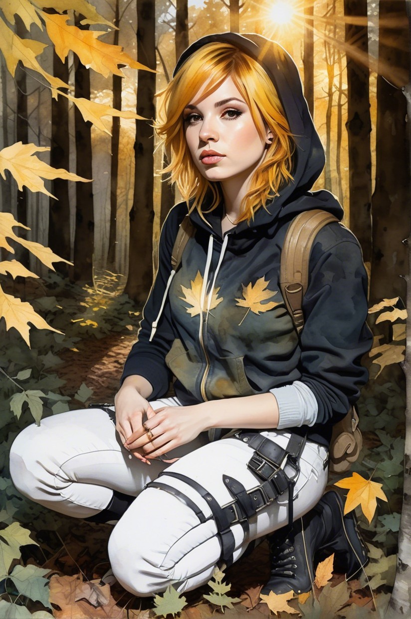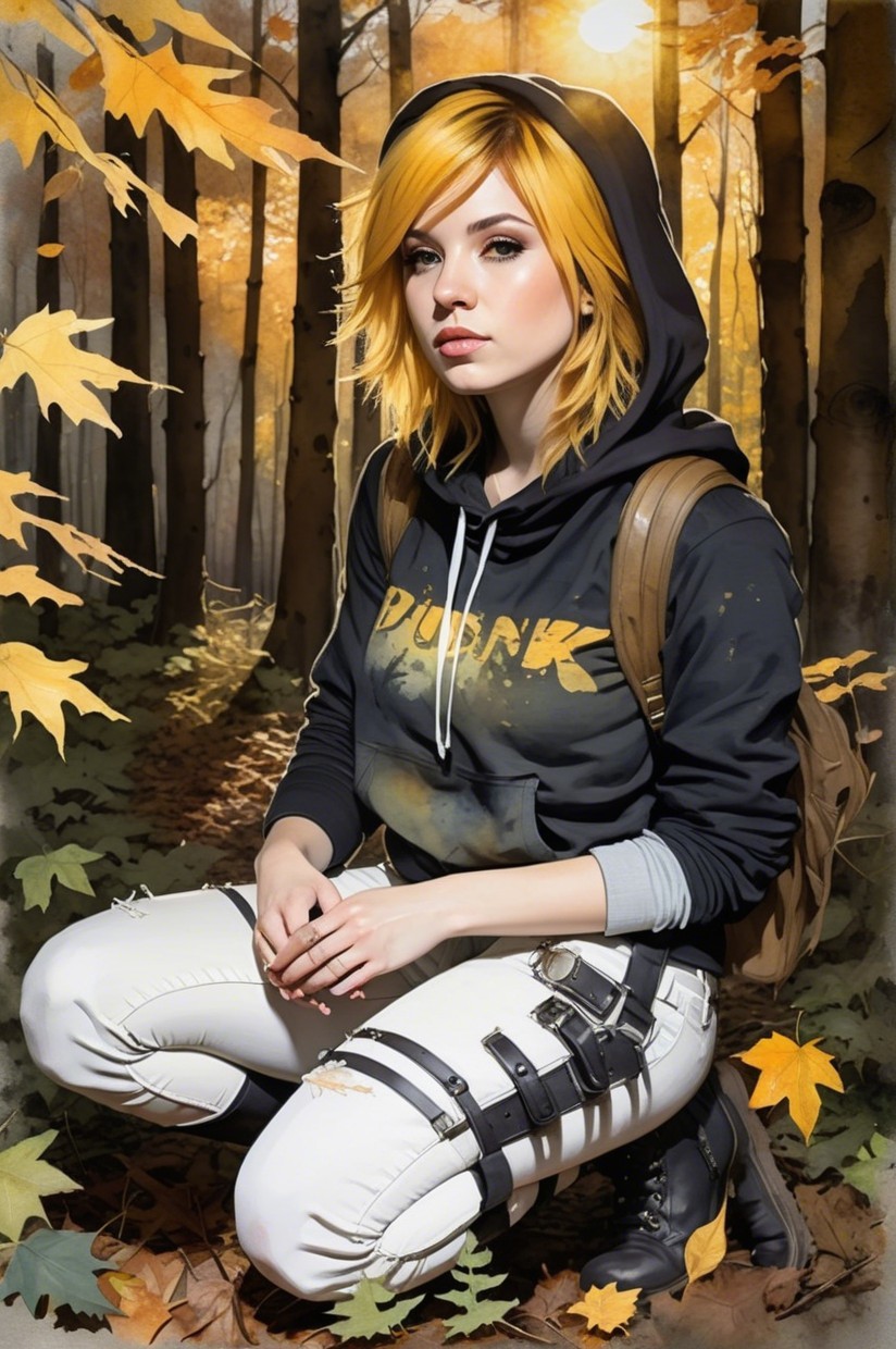 Prompt: Pen and ink sketch with overlaying transparent layers, 3D effects, hies, wide-angle, grungy watercolor and ink merged with pen and ink, oveespray of paint, blotting, punk rock girl kneeling in forest, foliage, golden crepuscular sunrays filtering through the canopy of an autumnal oak and birch forest, fine watercolor and ink strokes, color glitch, 135mm photography, dethereal, xeroxed, cel-shaded, dethereal, panavision, filmed with Ilford Sprite 35-ii Reusable camera, push processing, Sepia tones, weathered oak and birch trees with branches under the pale yellow autumn sun, vibrant red leaves and foliage carpeting the forest floor, cheerful autumn scene, luminal soft parametric light and shade extension, transpositional invisible aperture, soft filled backlighting. back-lit. Dreamscape, traumacore 1.9, Enhanced according to light source, color glitch, ominous light beams, flamboyant light beams, sun rays, detailed face, dark hooded cloak, estranged metallic colors, gradient light transitions, squiggly lines, plasticity 1.6, octane render, uhd, hdr, 64K, parallax occlusion 1.2, anisotropic filtering 1.7, raytraced shadows 1.8, high coloring 1.9, overall composition by Georgia O'Keeffe and Susan Seddon Boulet, sawtooth wave, Negative Lucas numbers, Digital topology, LiDAR point cloud, precise Gelsculpt 4k, Novelty architecture,Legit emotional reactions, perfect body coordination, perfectly flowing emotions, perfectly resonated aesthetics, actual realistic image of motion, Representation With Expressive Marks,